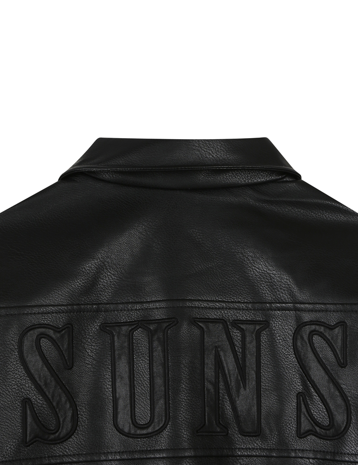 가슴과 등판에 빅하게 가죽아플리케 작업과 가슴 상단에 견고하게 작업 된 자수 아트웍이 포인트가 되는 스타일