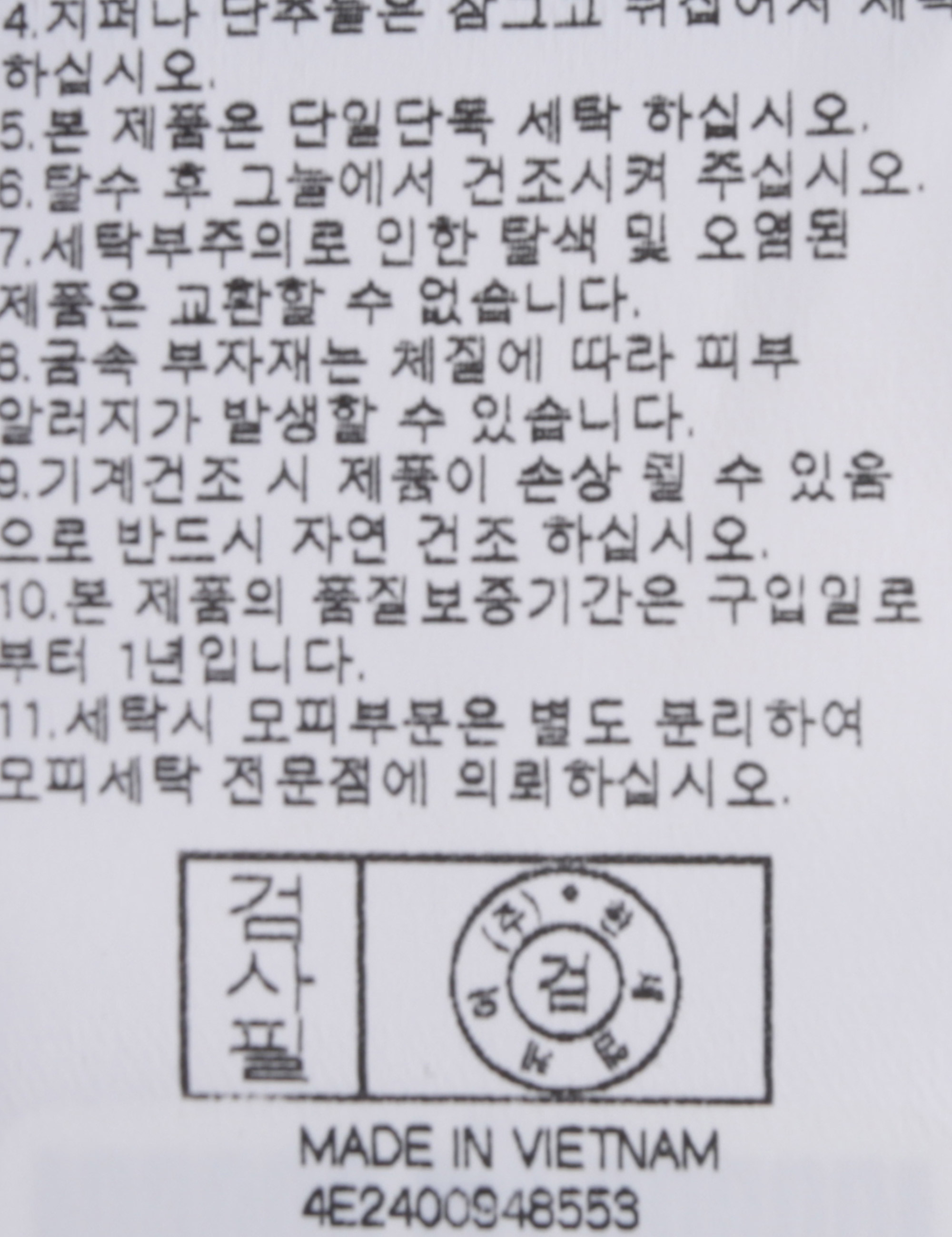 | 세탁방법 및 취급시 주의사항 | 본 제품은 손세탁 하십시오.(케어라벨참고) |