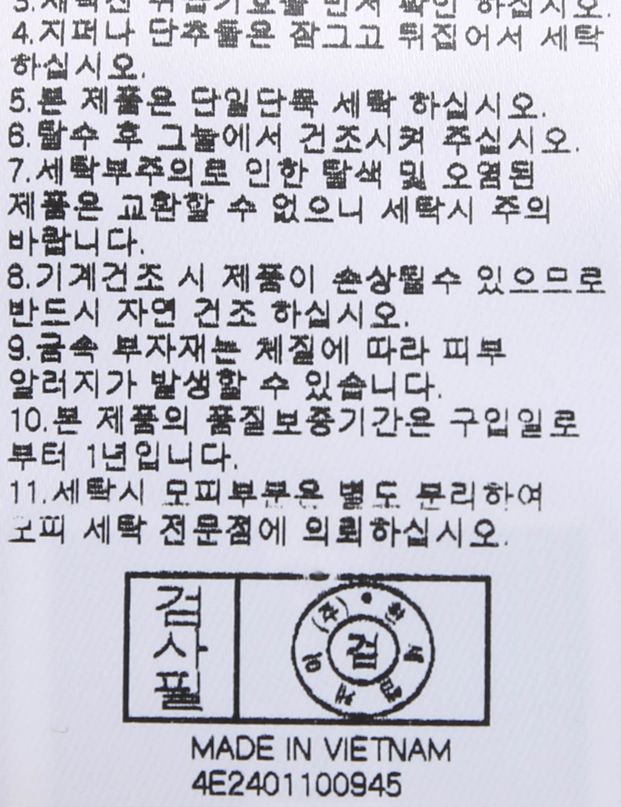 | 세탁방법 및 취급시 주의사항 | 본 제품은 손세탁 하십시오.(케어라벨참고) |