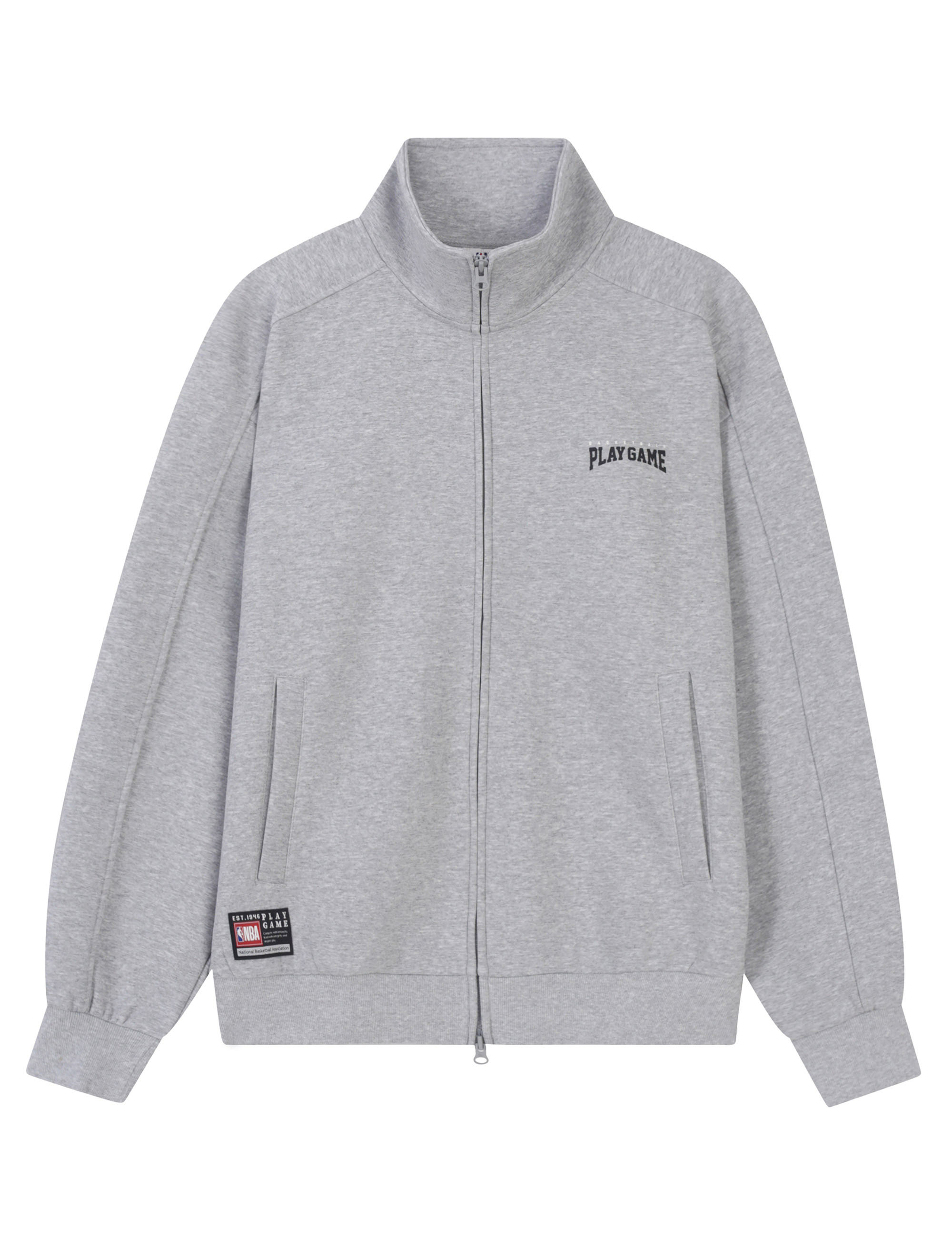 스탠넥 스타일의 집업 스타일로, 스몰 로고와 PLAY GAME 직조 라벨로 포인트를 줌