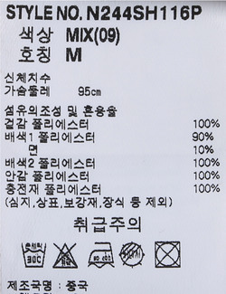 | 세탁방법 및 취급시 주의사항 | 본 제품은 손세탁 하십시오.(케어라벨참고) |