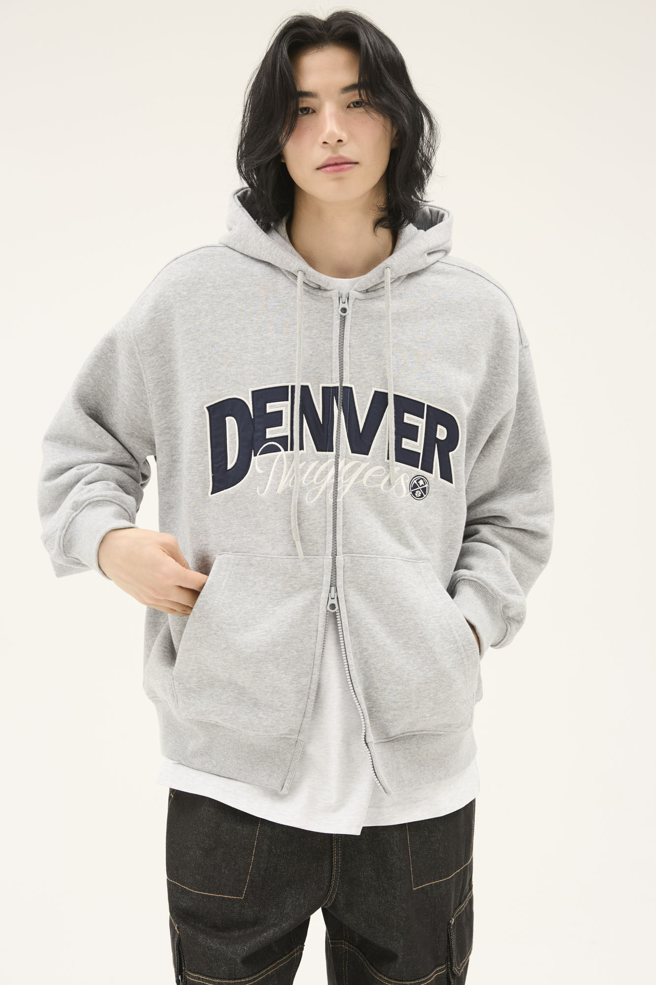 봄 간절기 시즌에 가볍게 착용하기 좋은 루즈핏의 후드 집업으로 아치형 팀로고를 아플리케와 직자수 기법으로 작업