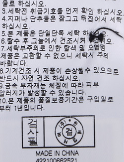| 세탁방법 및 취급시 주의사항 | 중성세제로 단 시간내에 세탁하십시오.(케어라벨참고) |
