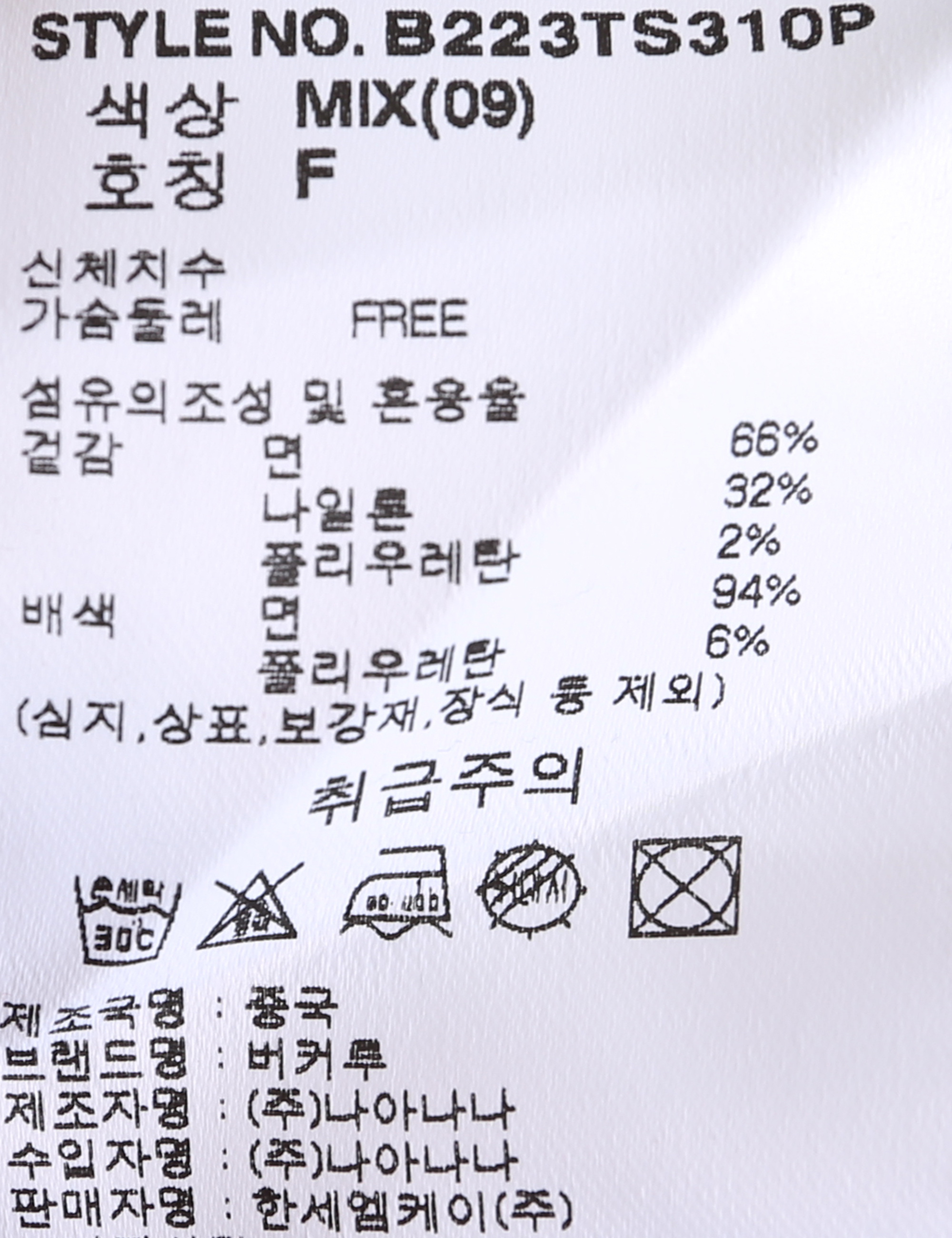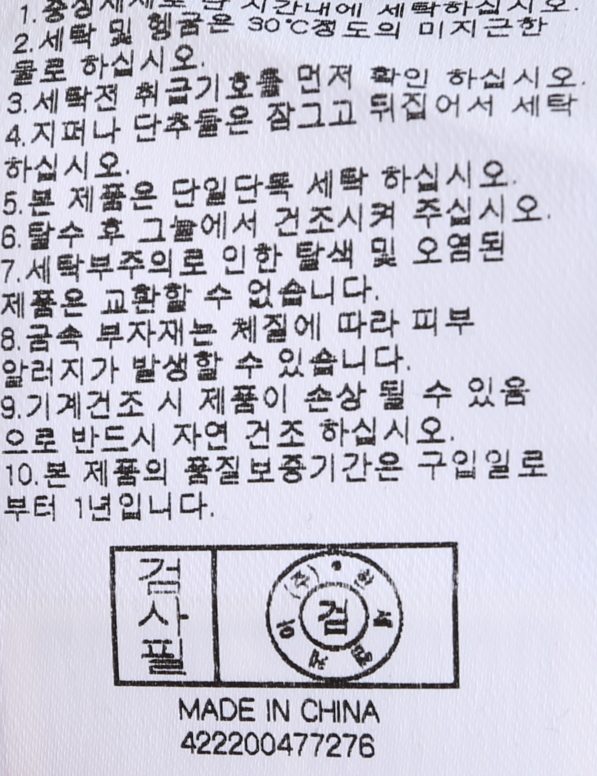 | 세탁방법 및 취급시 주의사항 | 본 제품은 손세탁 하십시오.(케어라벨참고) |