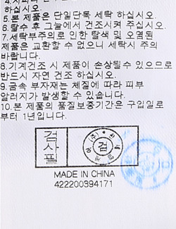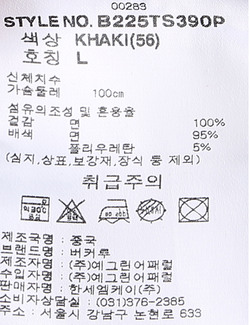 | 세탁방법 및 취급시 주의사항 | 중성세제로 단 시간내에 세탁하십시오.(케어라벨참고) |