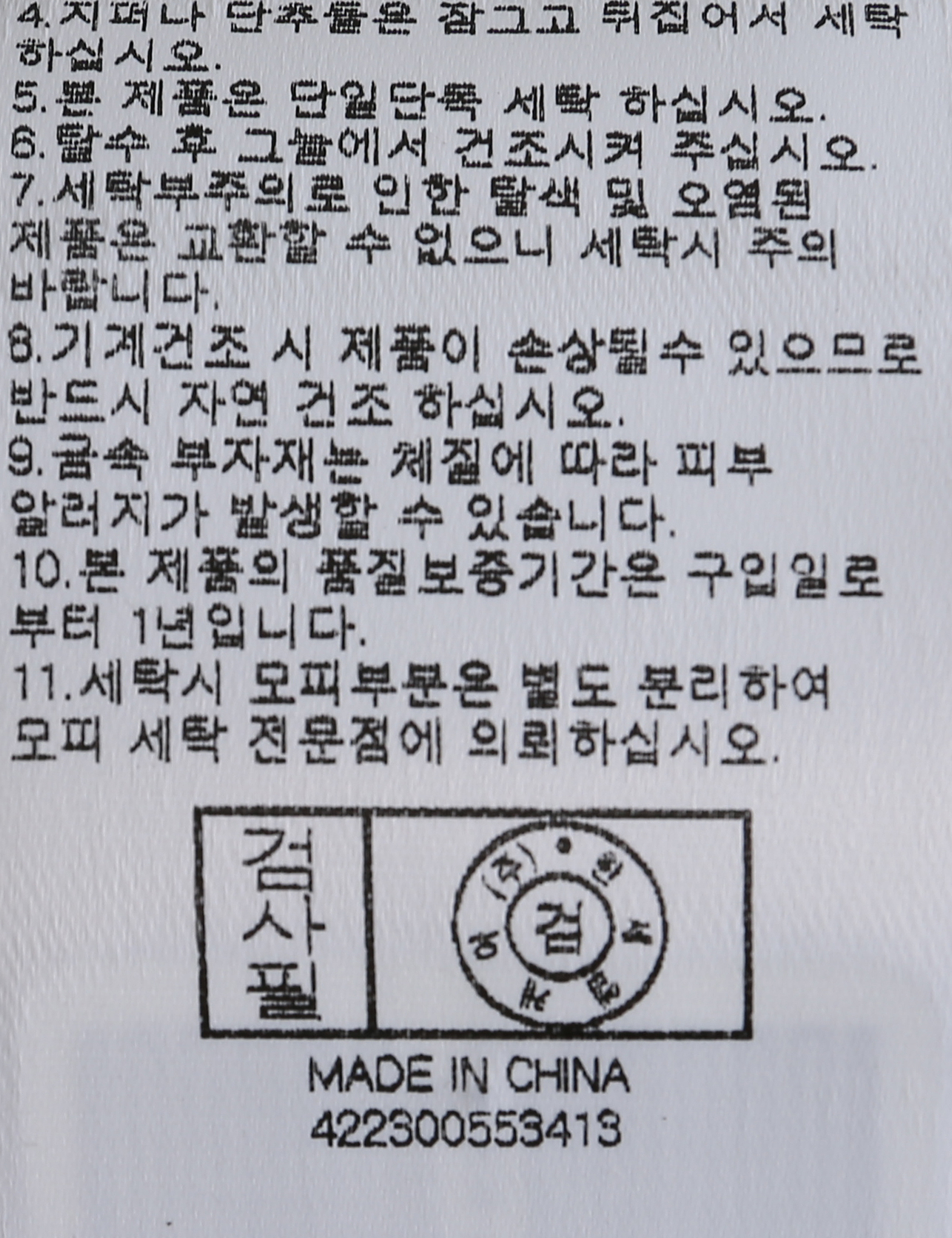 | 세탁방법 및 취급시 주의사항 | 중성세제로 단 시간내에 세탁하십시오.(케어라벨참고) |