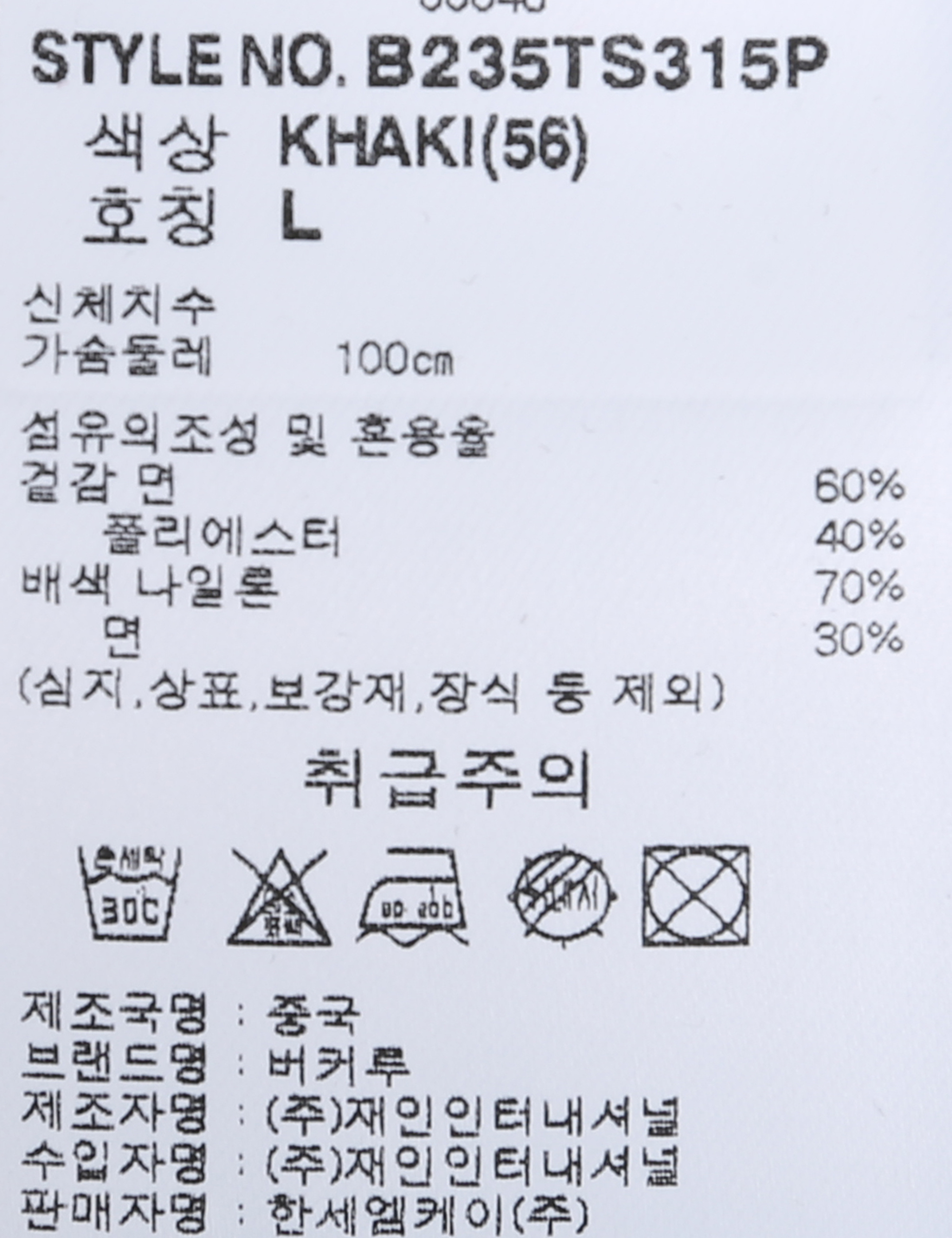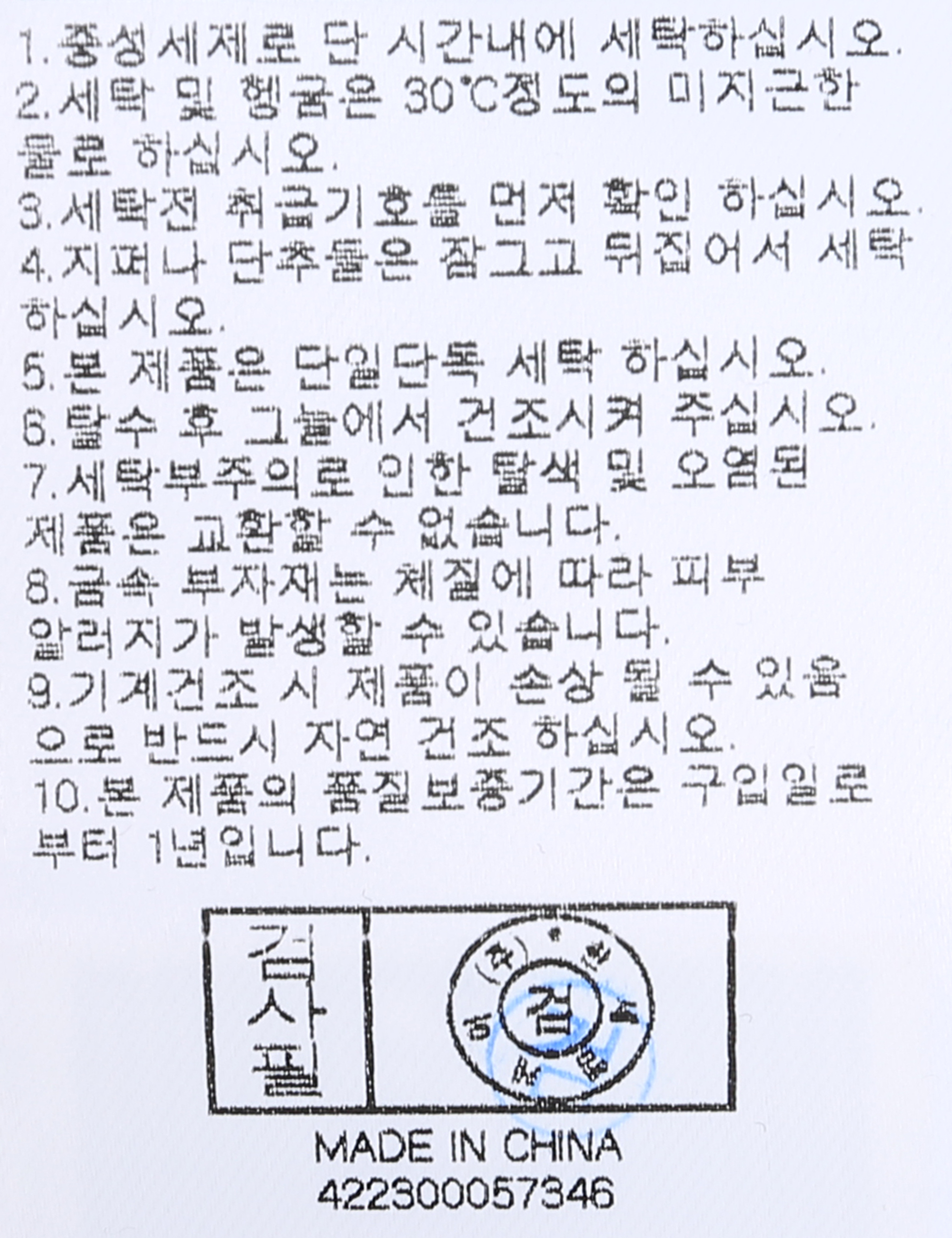 | 세탁방법 및 취급시 주의사항 | 본 제품은 손세탁 하십시오.(케어라벨참고) |