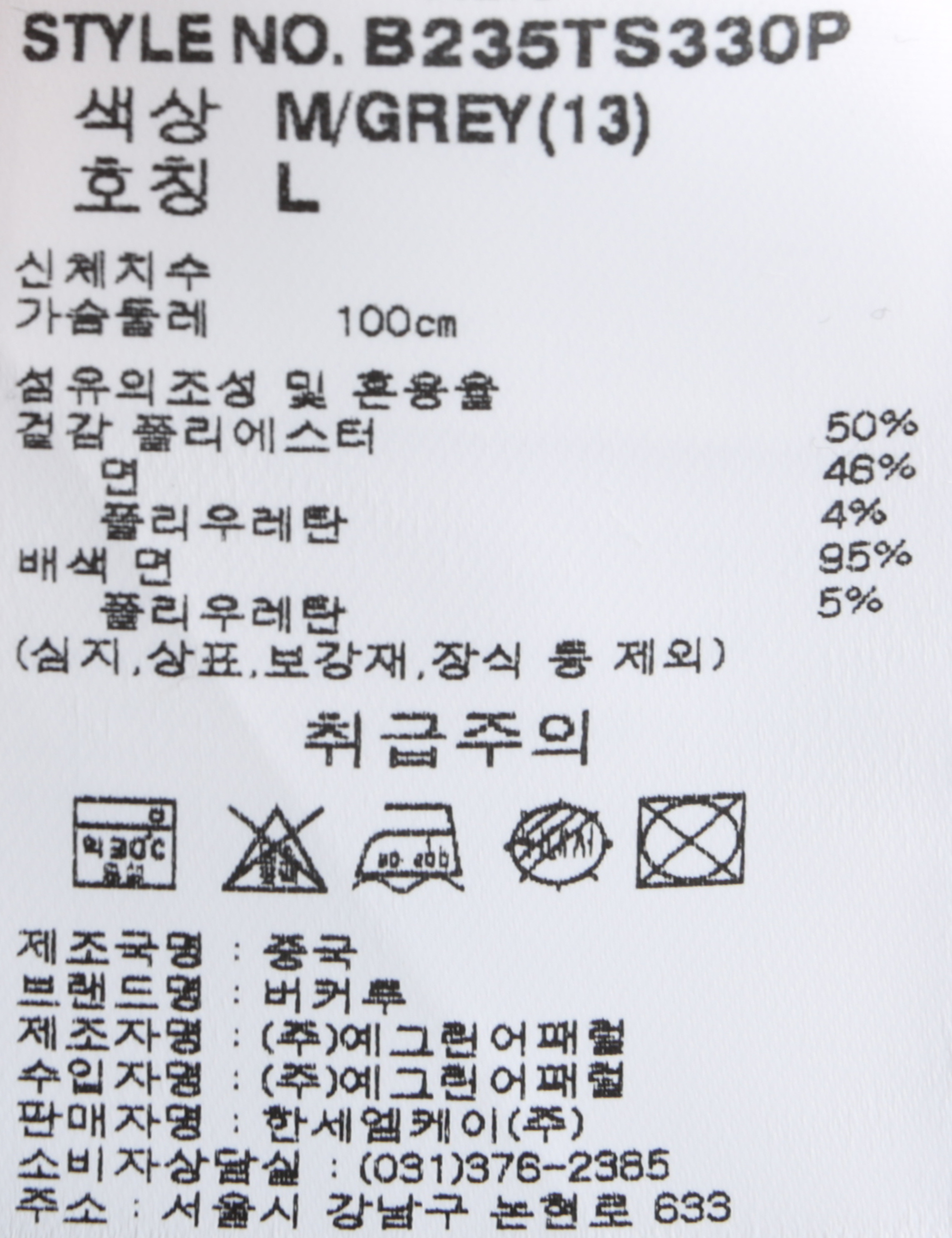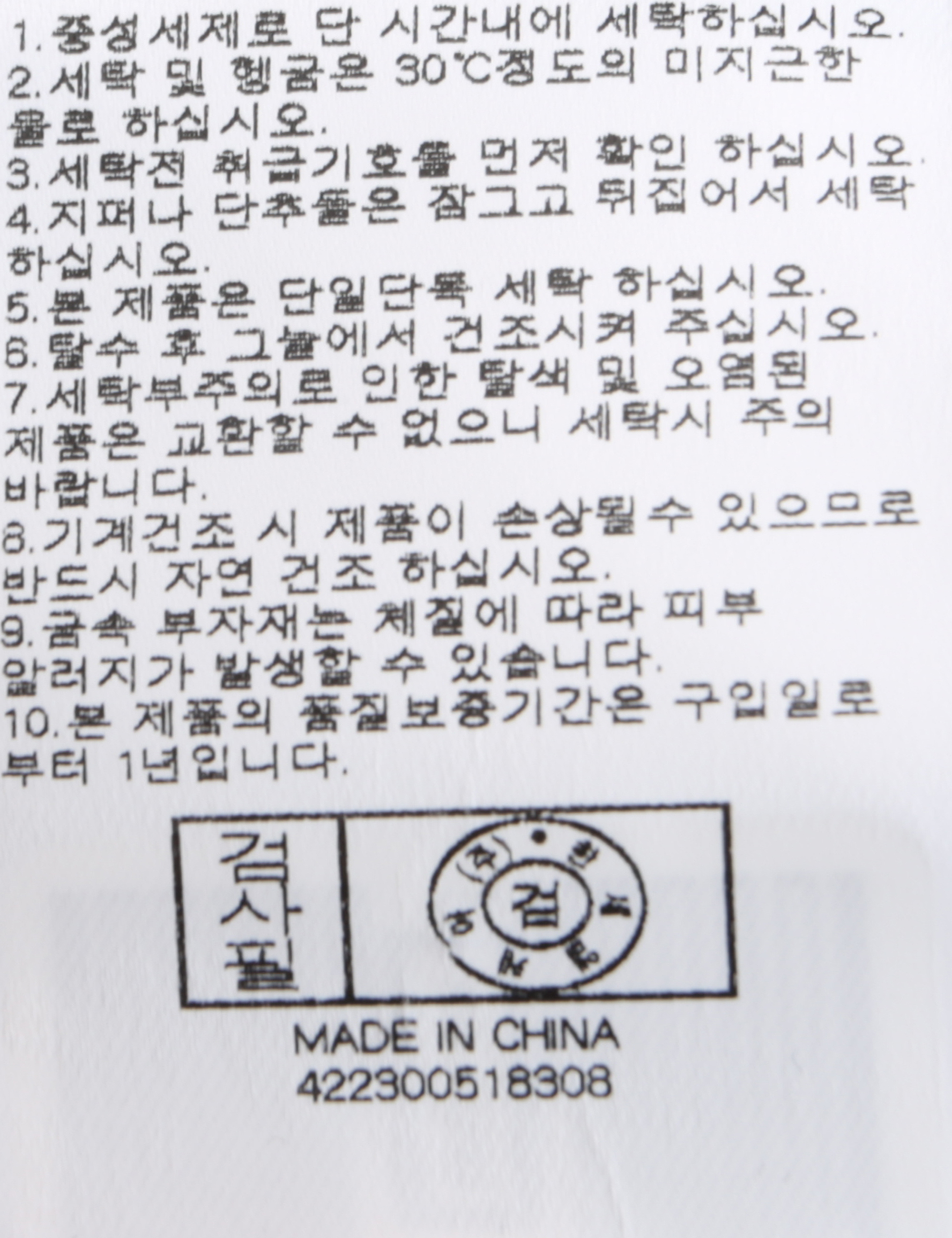 | 세탁방법 및 취급시 주의사항 | 중성세제로 단 시간내에 세탁하십시오.(케어라벨참고) |