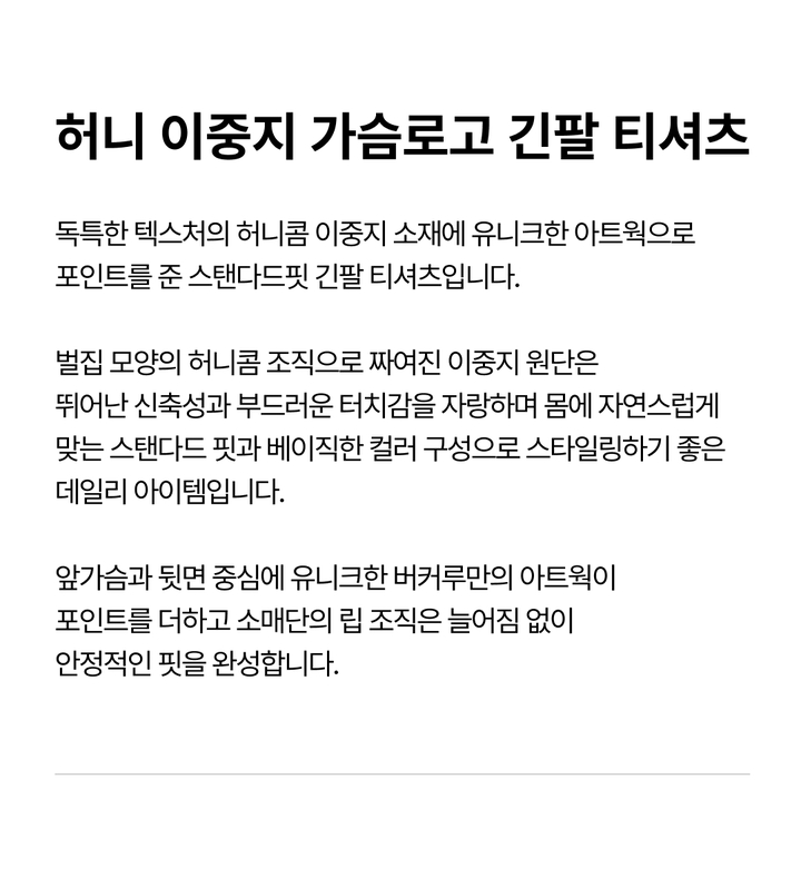 | 상품명 | 허니 이중지 가슴로고 긴팔 티셔츠(B253Z1101P) |