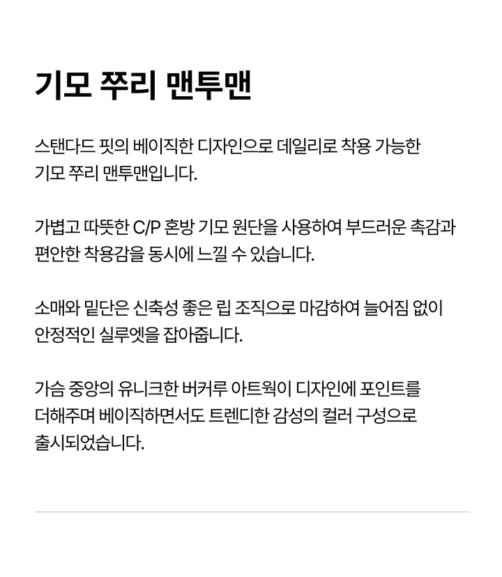 | 상품명 | 기모 쭈리 맨투맨(B254Z1010P) |