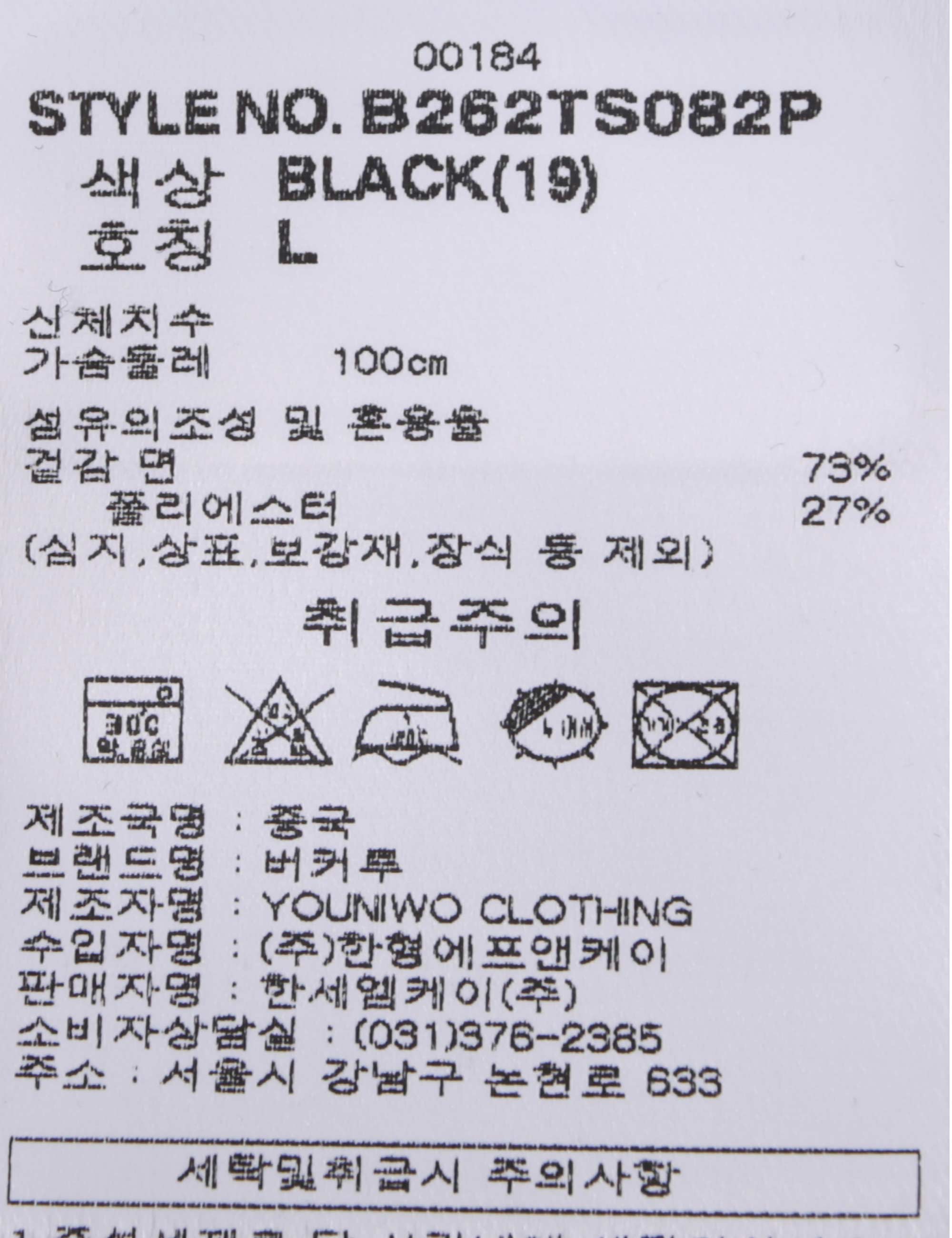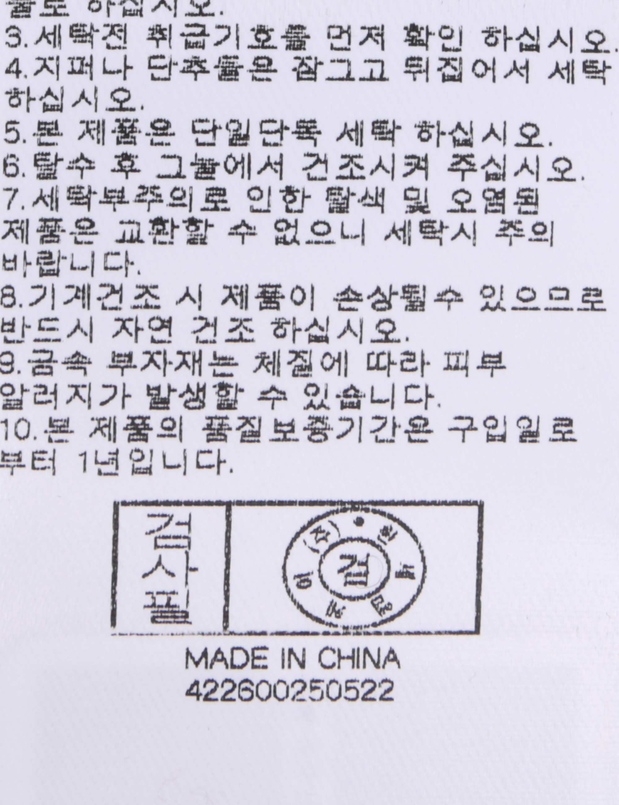 | 세탁방법 및 취급시 주의사항 | 중성세제로 단 시간내에 세탁하십시오.(케어라벨참고) |