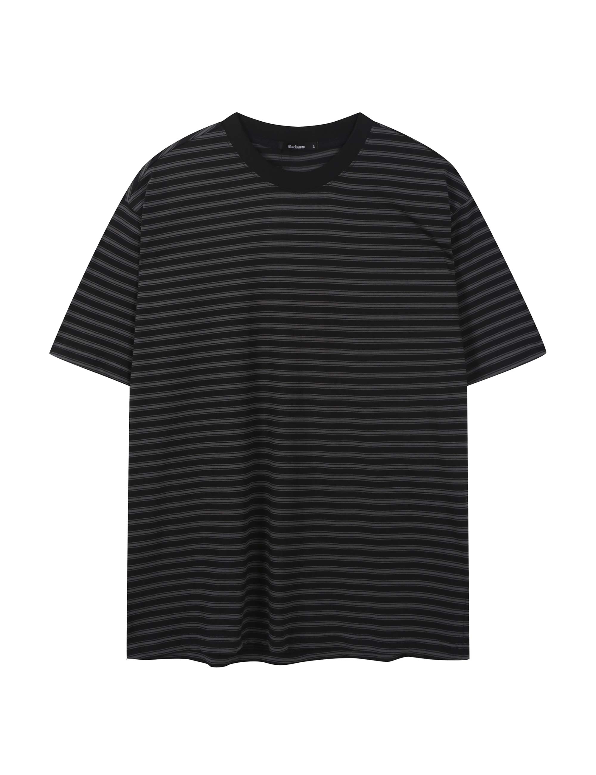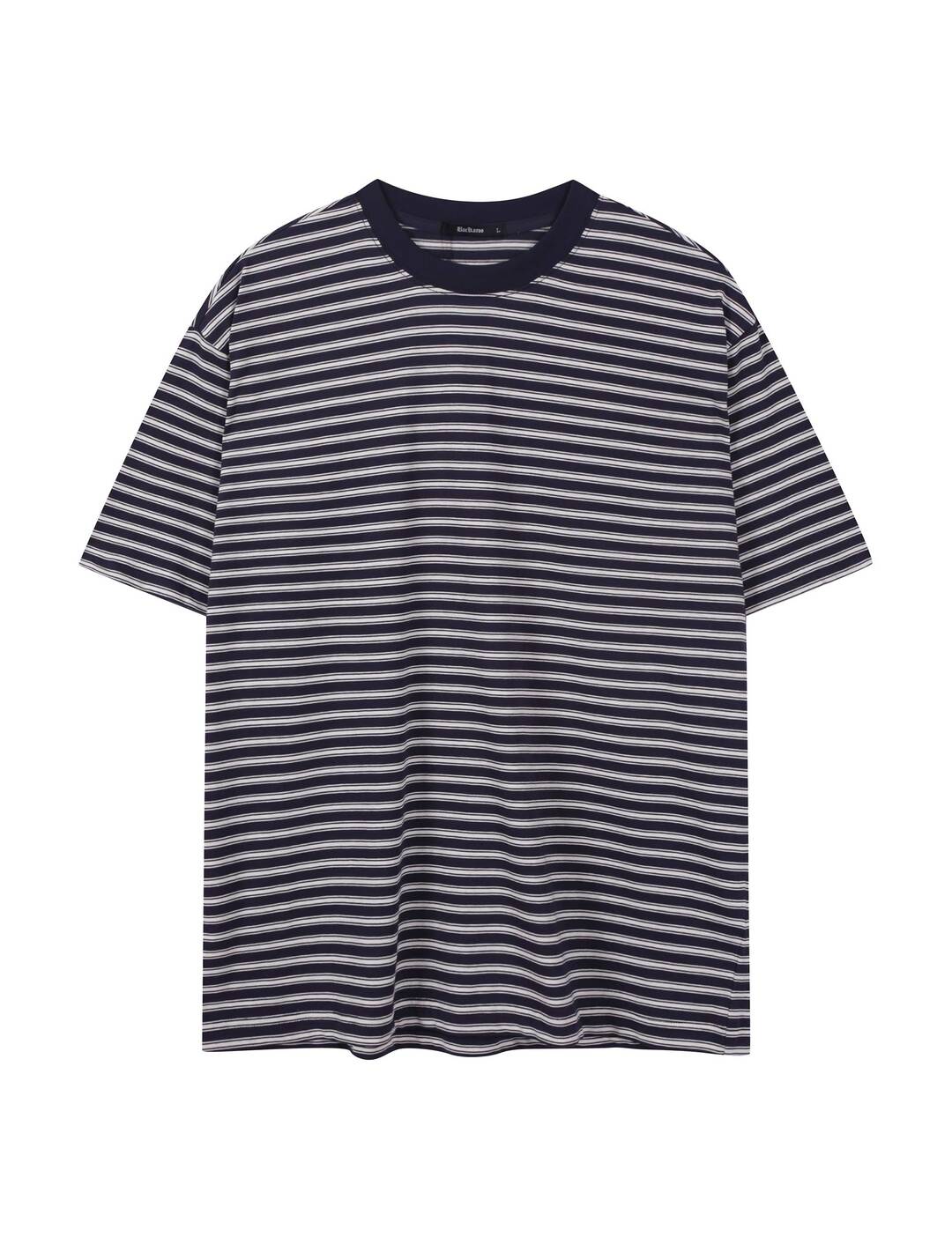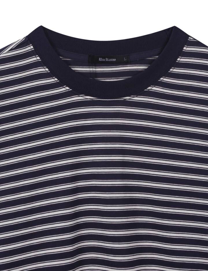 깔끔한 스트라이프 패턴 디자인 시원하고 쾌적한 40수 고밀도 원단 사용 체형에 구애받지 않는 편안한 루즈핏 실루엣 베이직한 라운드 넥 라인 마감 단독 손세탁 권장