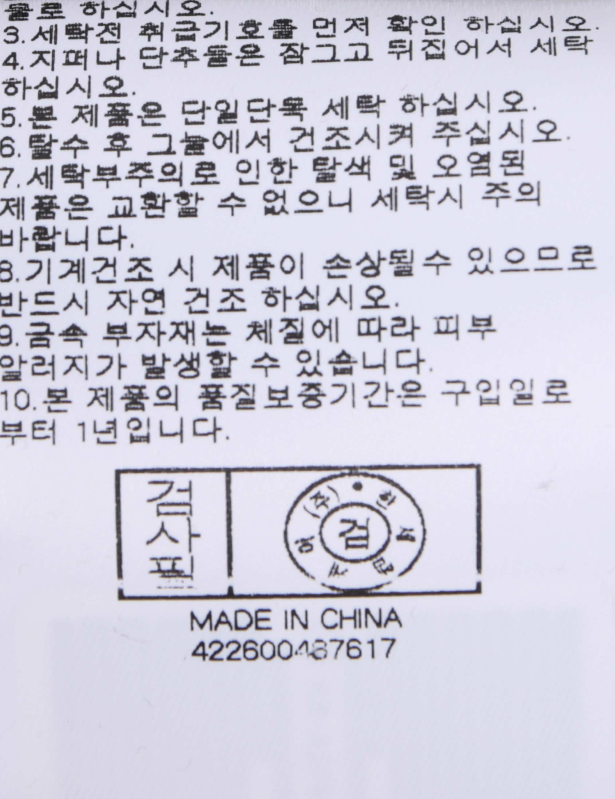 | 세탁방법 및 취급시 주의사항 | 중성세제로 단 시간내에 세탁하십시오.(케어라벨참고) |