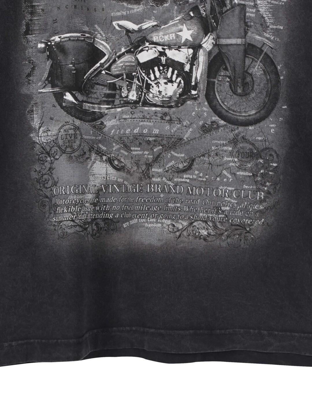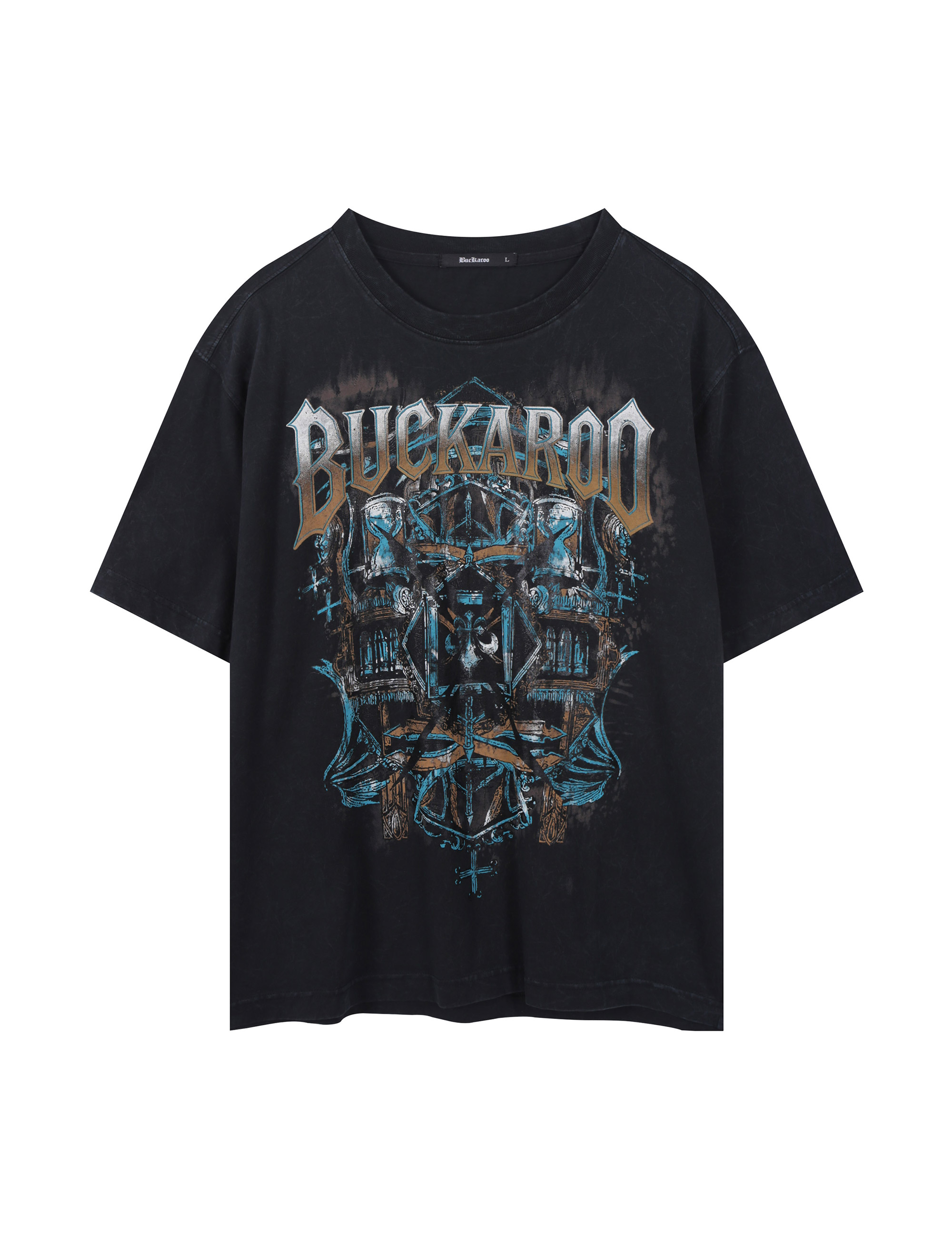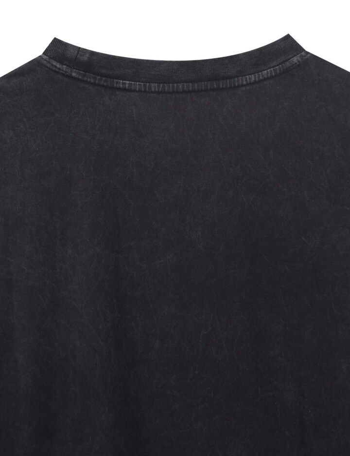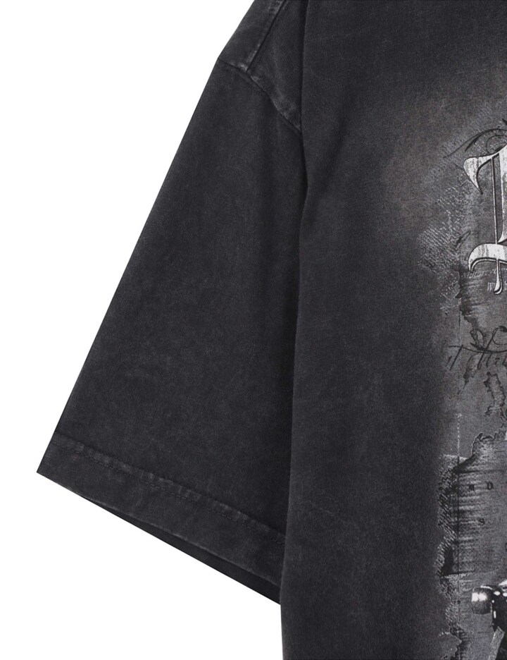 가먼트 다잉과 감각적인 락시크 아트워크로 빈티지한 무드를 더한 남성용 20수 싱글 루즈핏 반팔 티셔츠