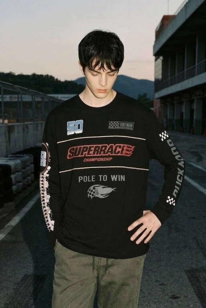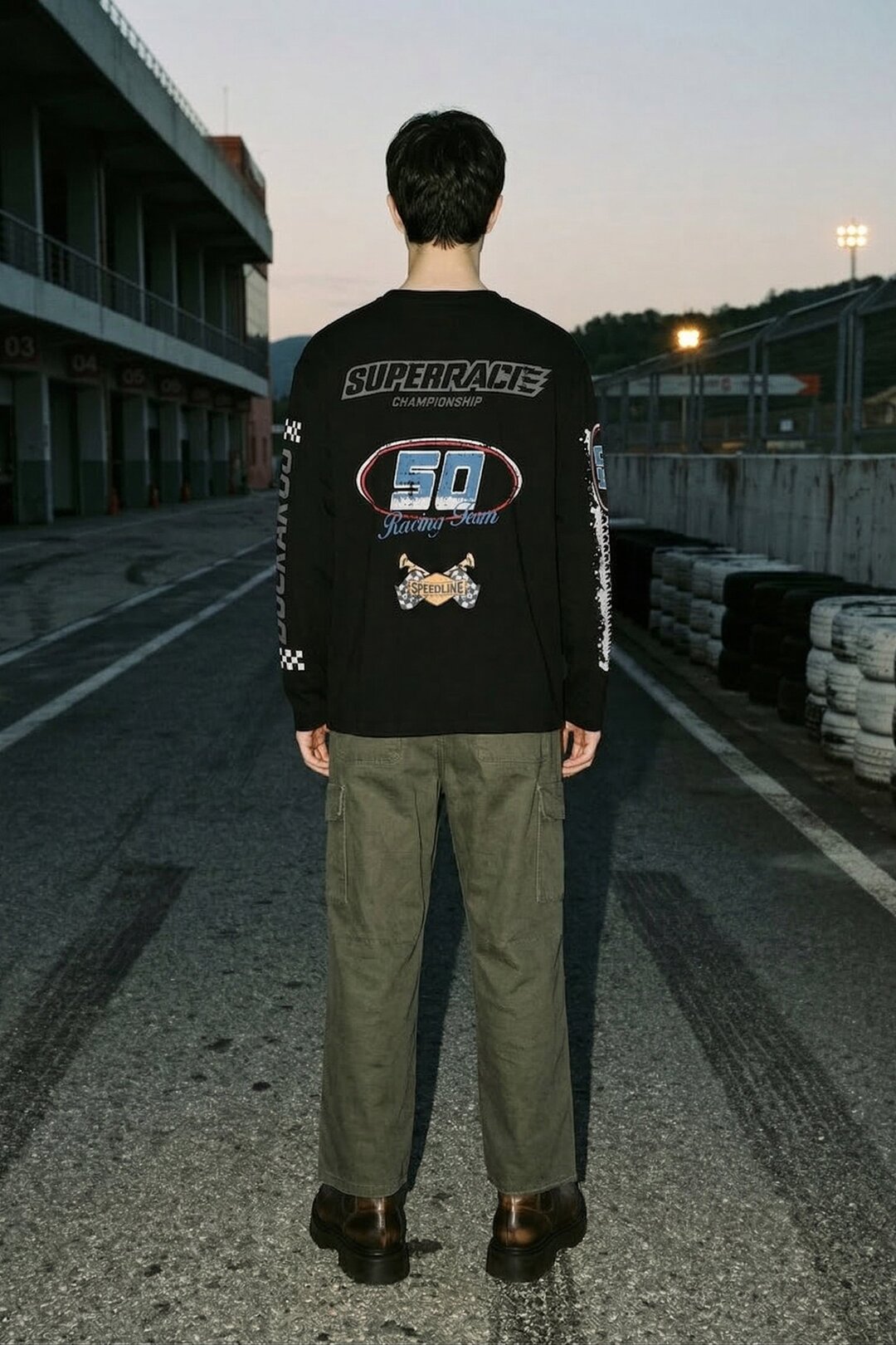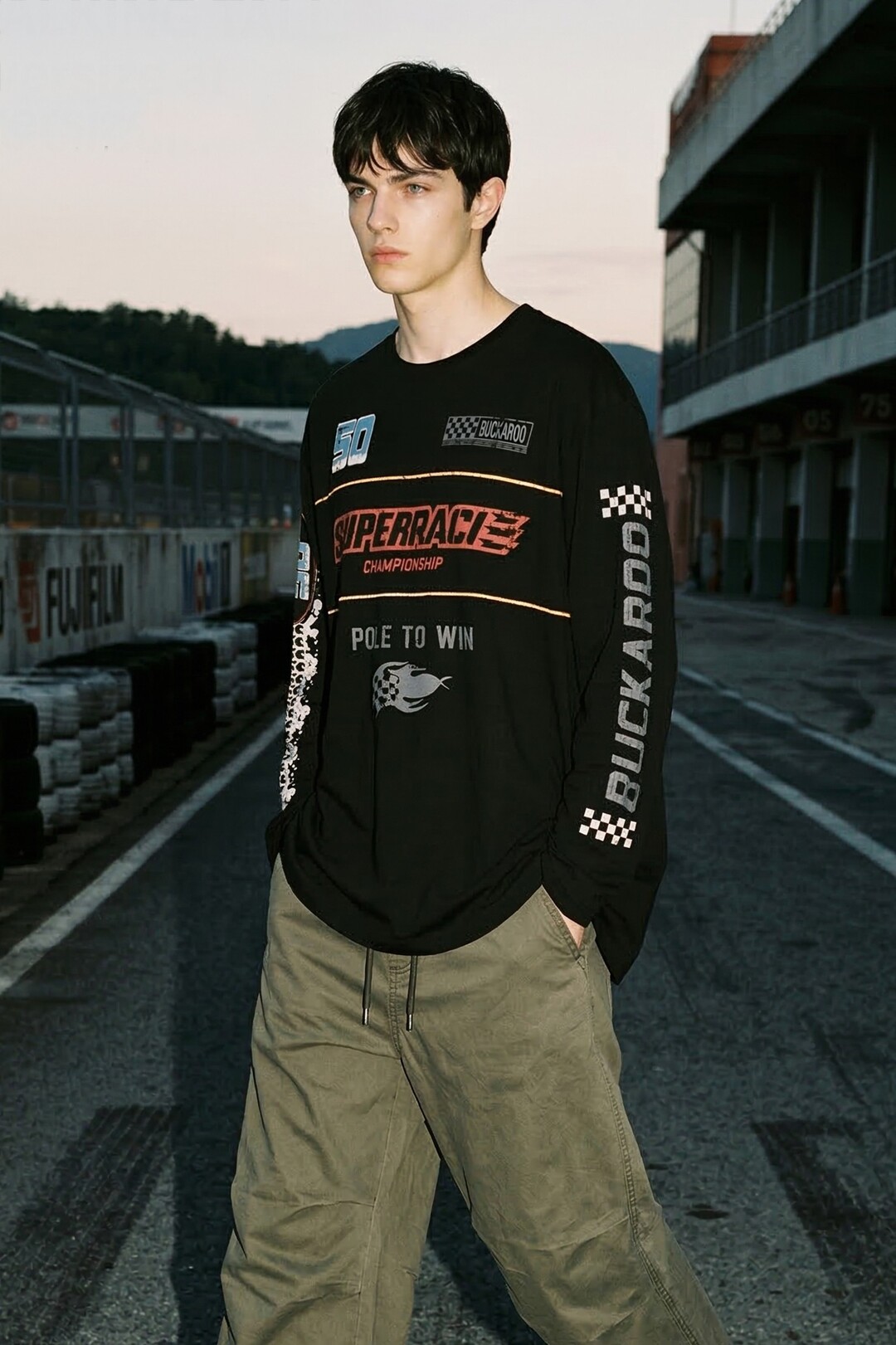 버커루 빈티지 감성과 슈퍼레이스 레이싱 에너지를 담은 2026 콜라보 아트웍 오버핏 긴팔 티셔츠