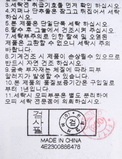 | 세탁방법 및 취급시 주의사항 | 중성세제로 단 시간내에 세탁하십시오.(케어라벨참고) |