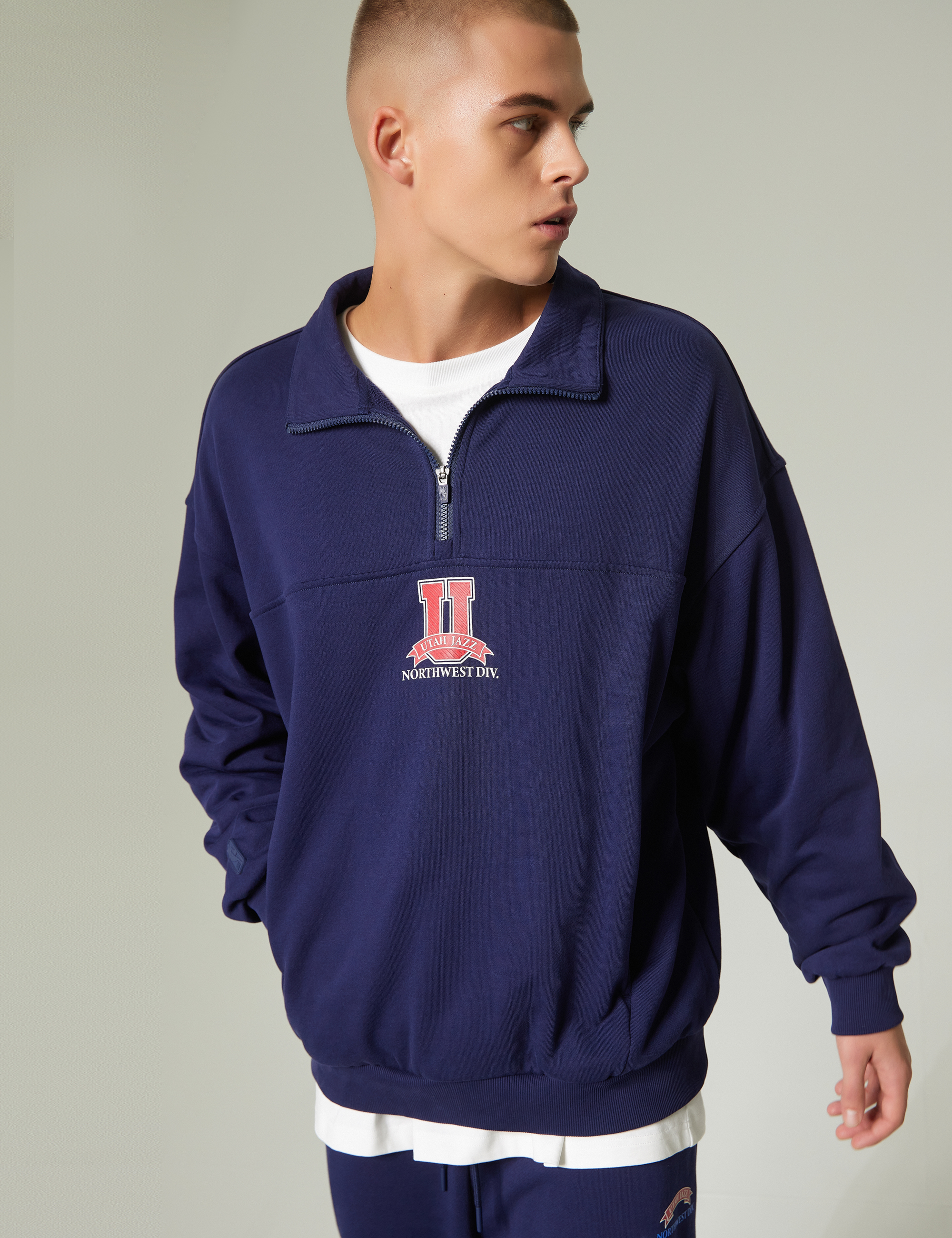 팀 레터를 이용한 트렌디한 무드의 그래픽이 돋보이는 반집업 스타일 맨투맨.
