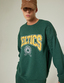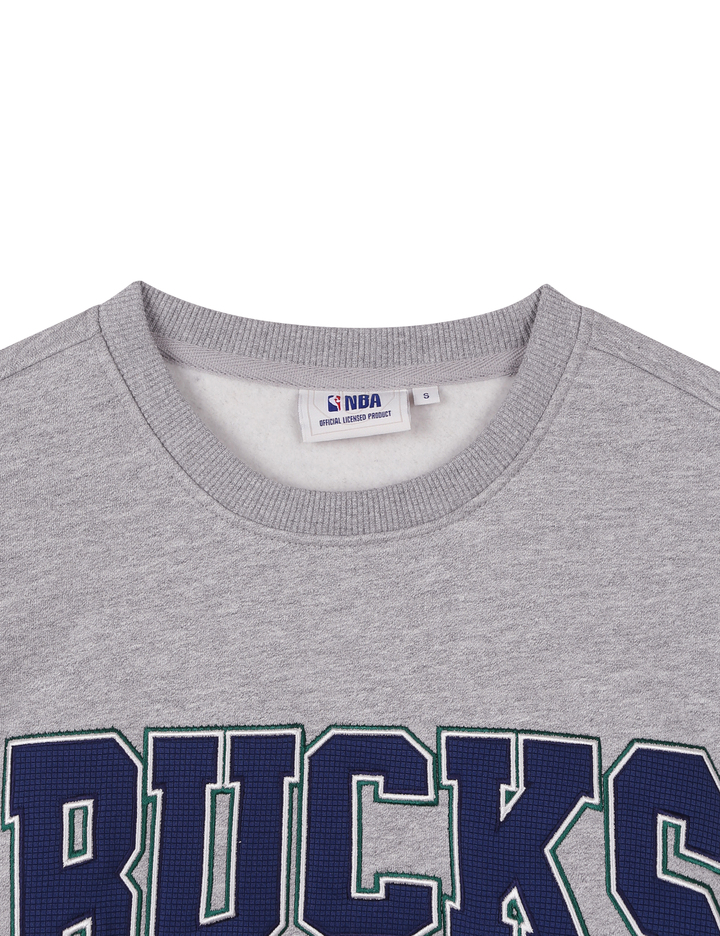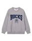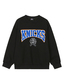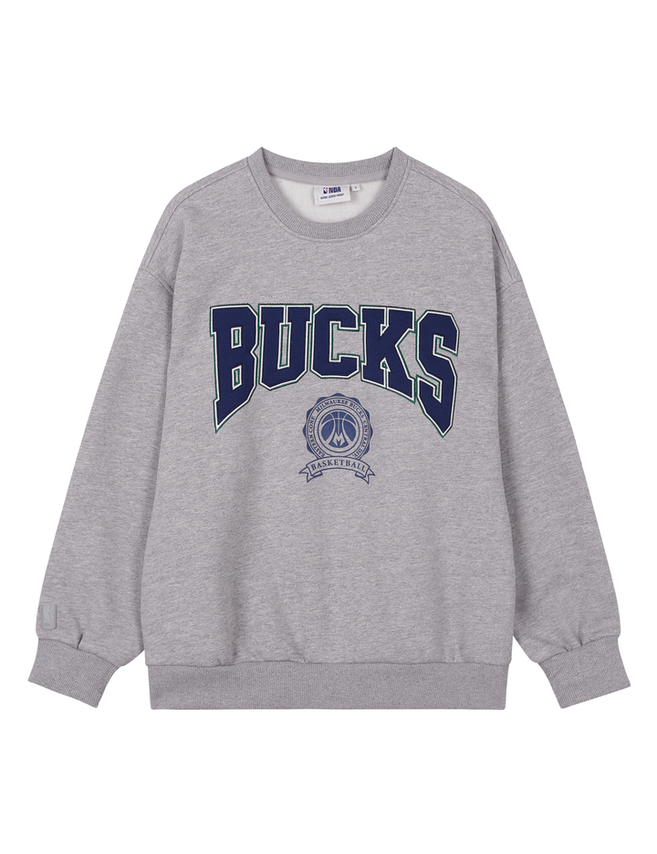 오버핏의 맨투맨으로 아치형 팀 로고의 트렌디한 컬러 배색이 돋보이는 스타일.