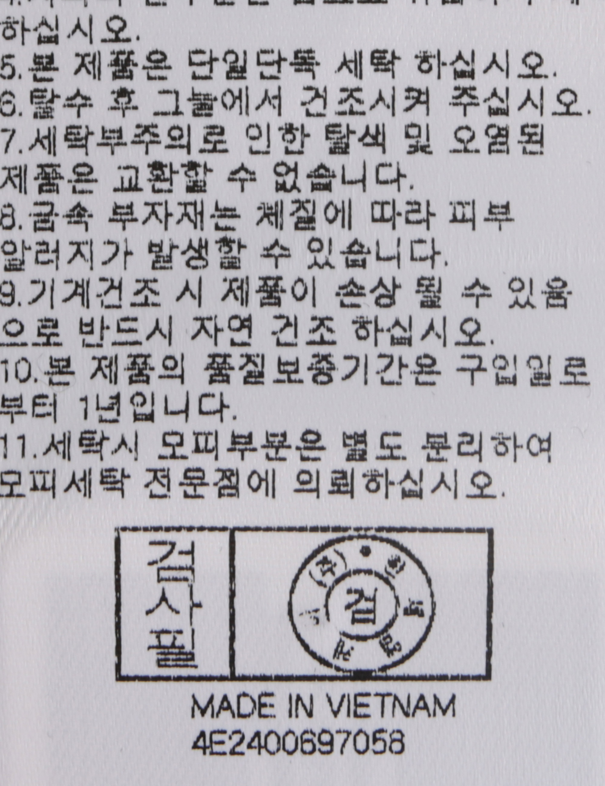 | 세탁방법 및 취급시 주의사항 | 본 제품은 손세탁 하십시오.(케어라벨참고) |