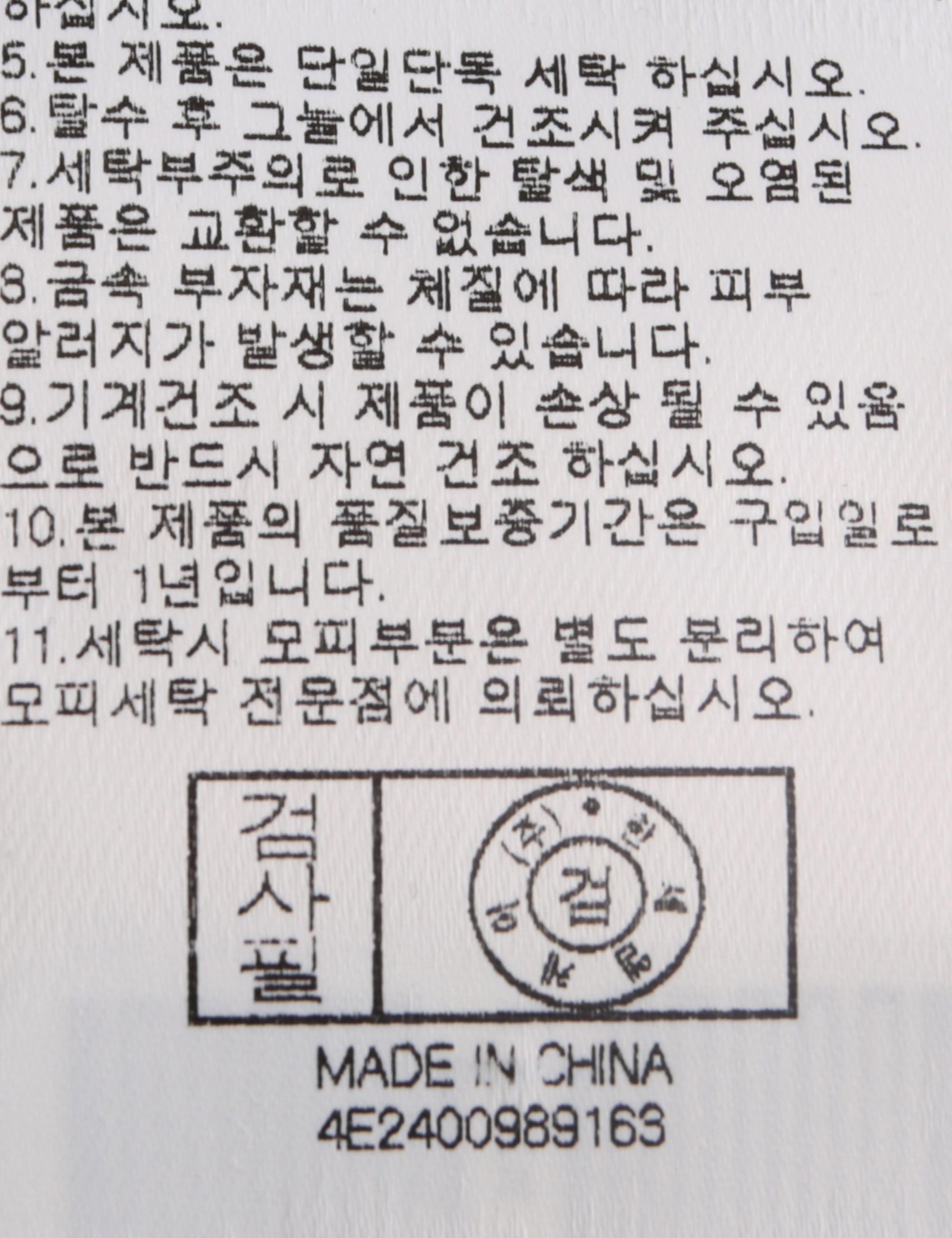 | 세탁방법 및 취급시 주의사항 | 본 제품은 손세탁 하십시오.(케어라벨참고) |