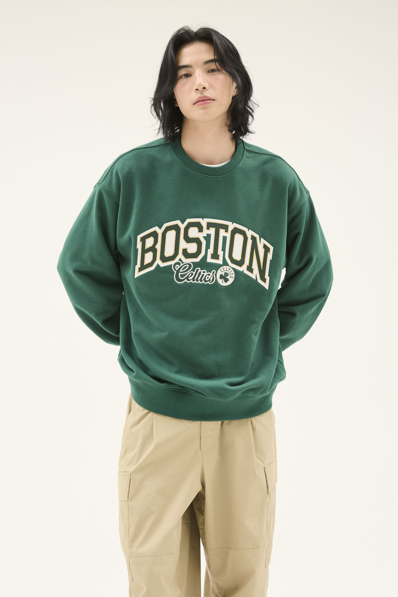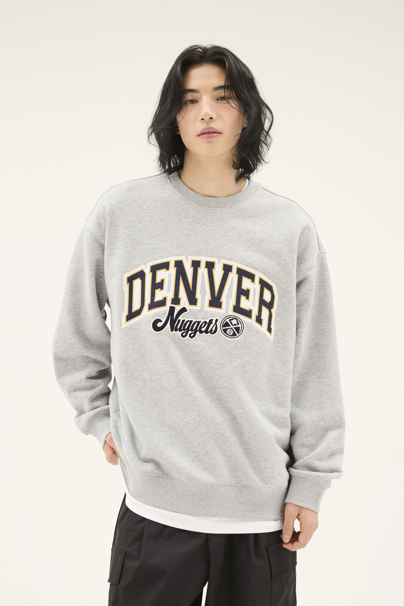 봄 간절기 시즌에 가볍게 착용하기 좋은 루즈핏의 맨투맨으로 아치형 팀로고를 아플리케와 직자수 기법으로 작업