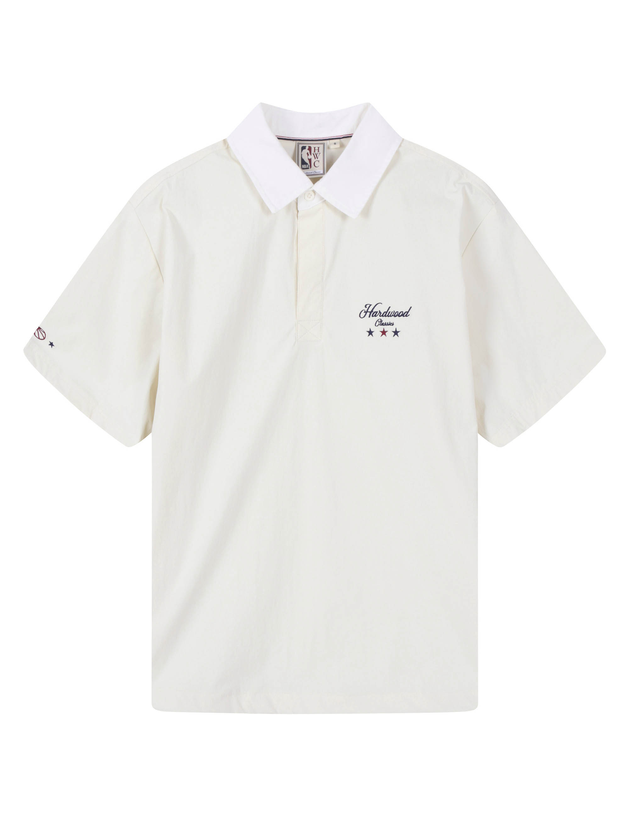 - 우븐 소재를 이용한 카라와 왼가슴에 하드우드 클래식 자수 그래픽이 포인트