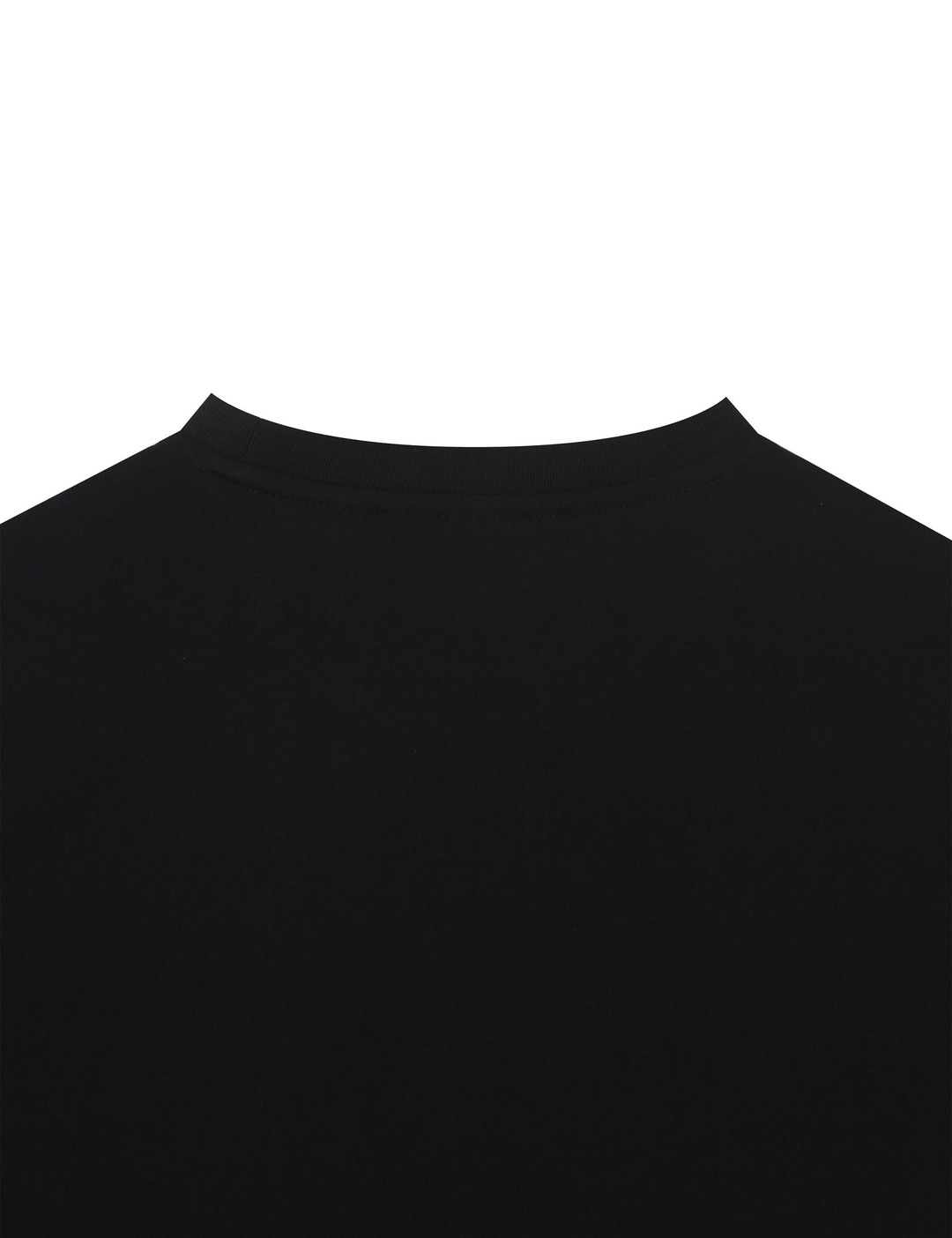 - 뒷넥에 테이프를 덧대어 목이 늘어나지 않게 견고하게 하였고 밑단에 직조라벨로 포인트를 더함