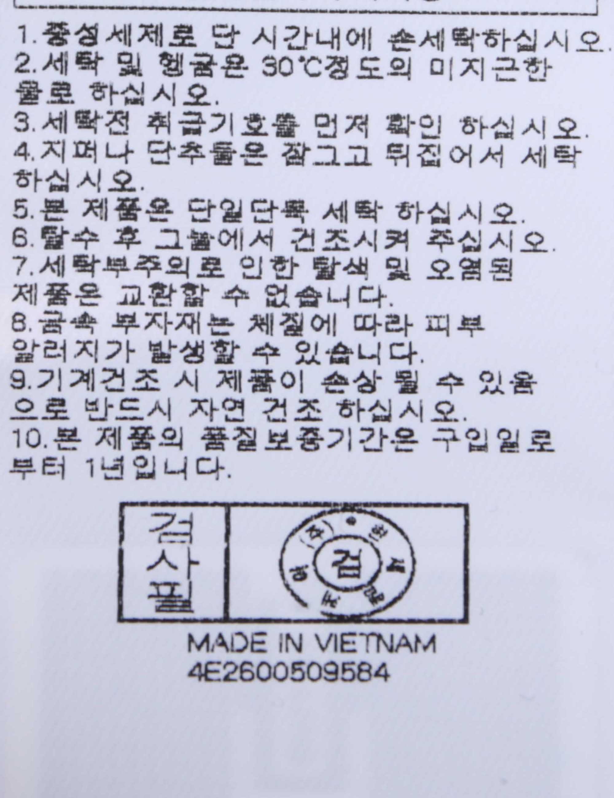 | 세탁방법 및 취급시 주의사항 | 본 제품은 손세탁 하십시오.(케어라벨참고) |