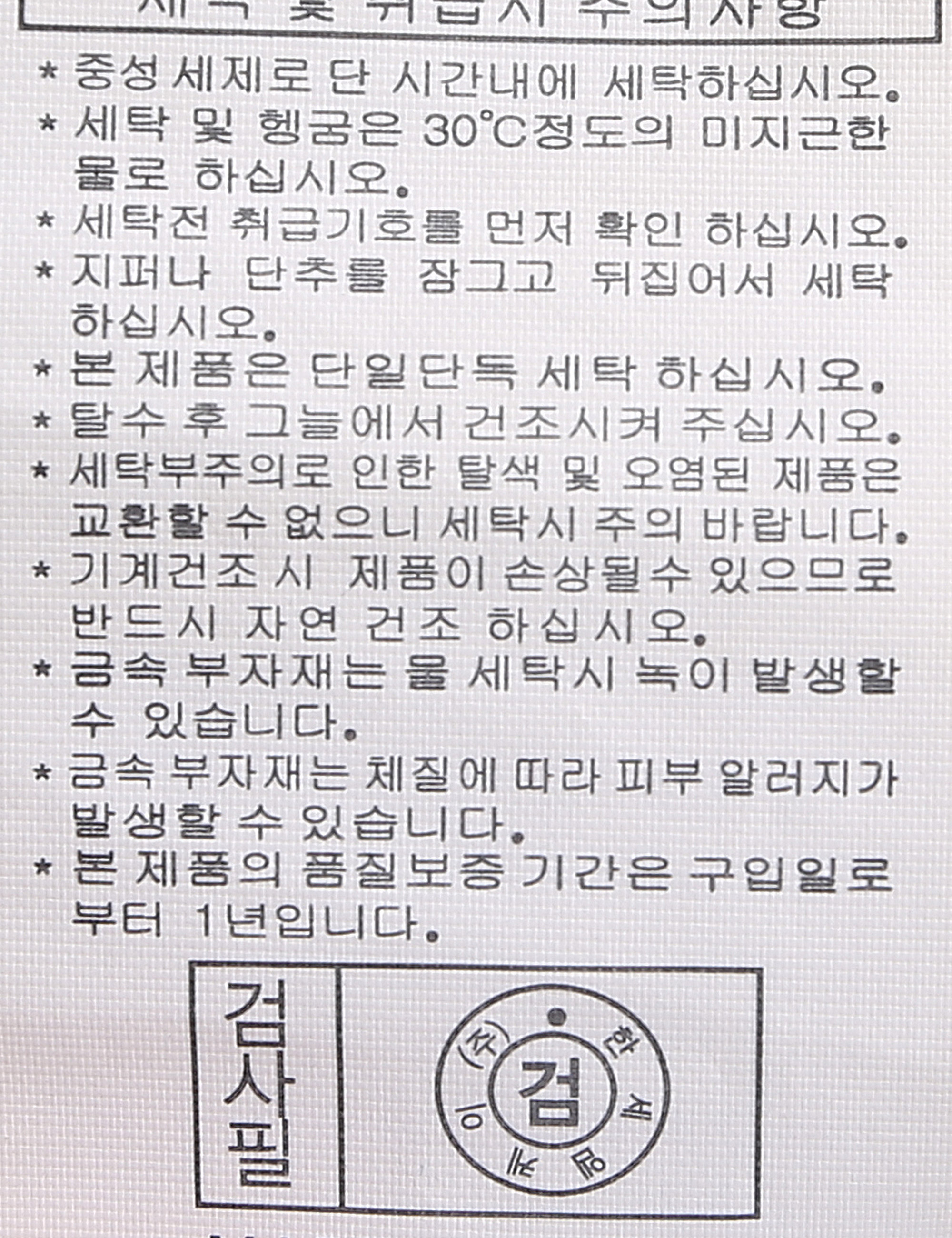| 세탁방법 및 취급시 주의사항 | 본 제품은 손세탁 하십시오.(케어라벨참고) |