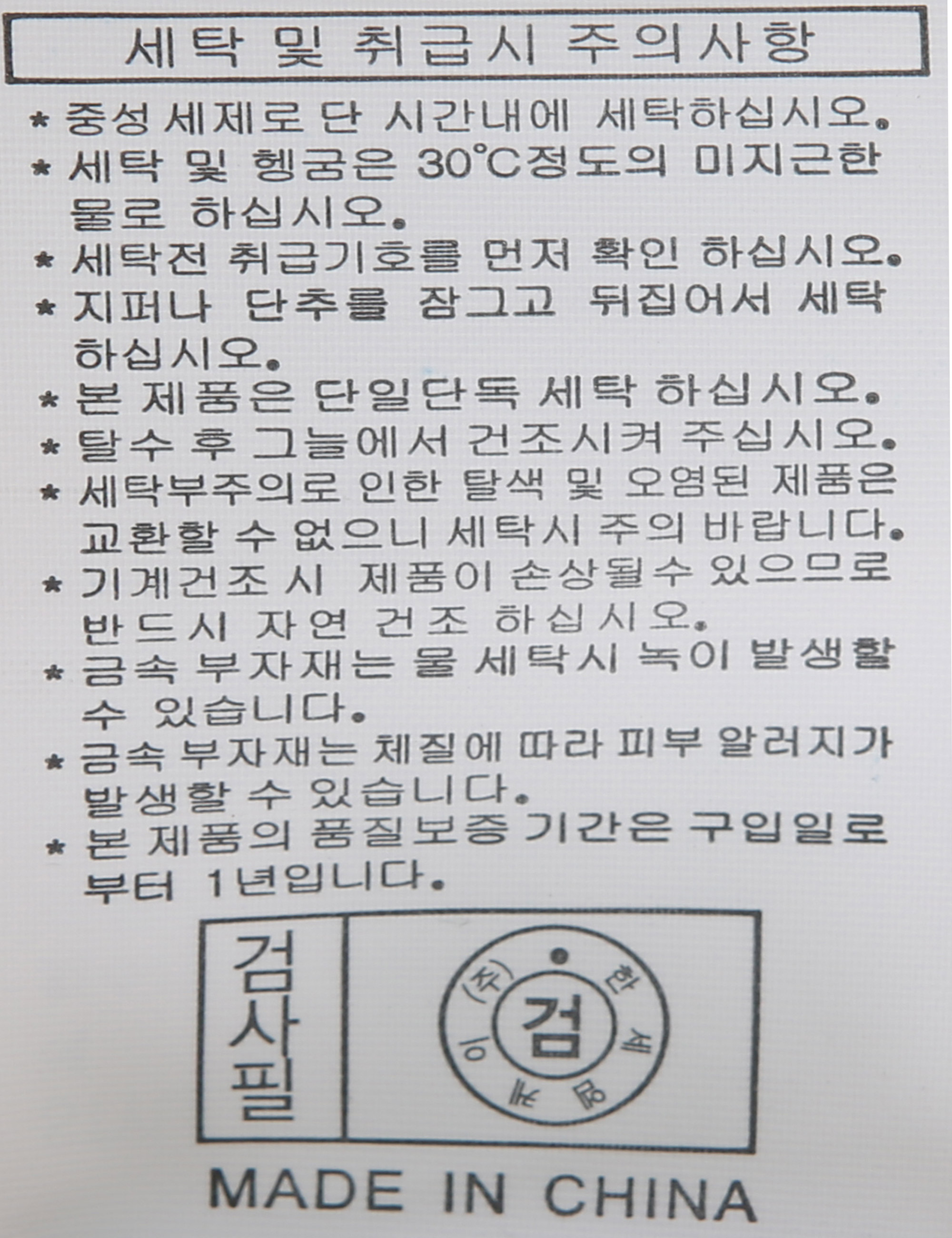 | 세탁방법 및 취급시 주의사항 | 본 제품은 손세탁 하십시오.(케어라벨참고) |