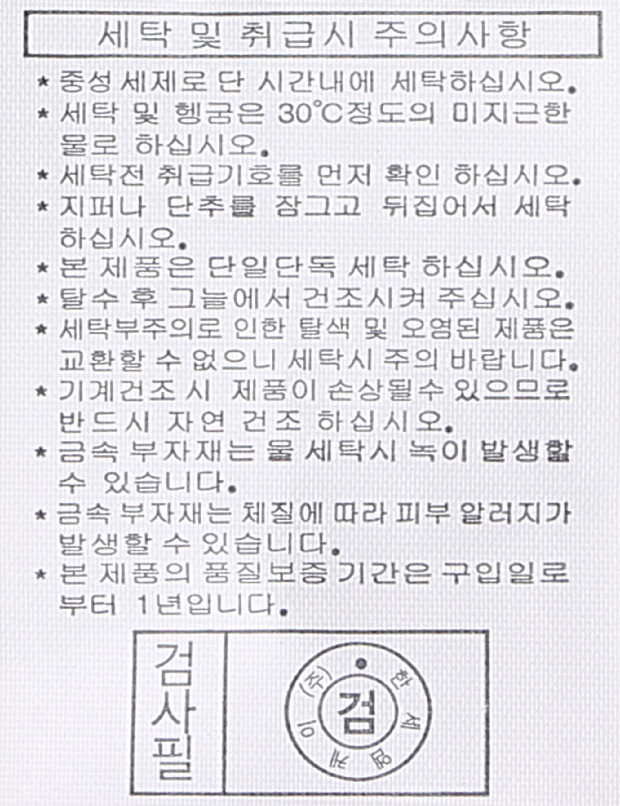 | 세탁방법 및 취급시 주의사항 | 본 제품은 손세탁 하십시오.(케어라벨참고) |
