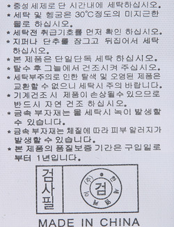 | 세탁방법 및 취급시 주의사항 | 중성세제로 단 시간내에 세탁하십시오.(케어라벨참고) |