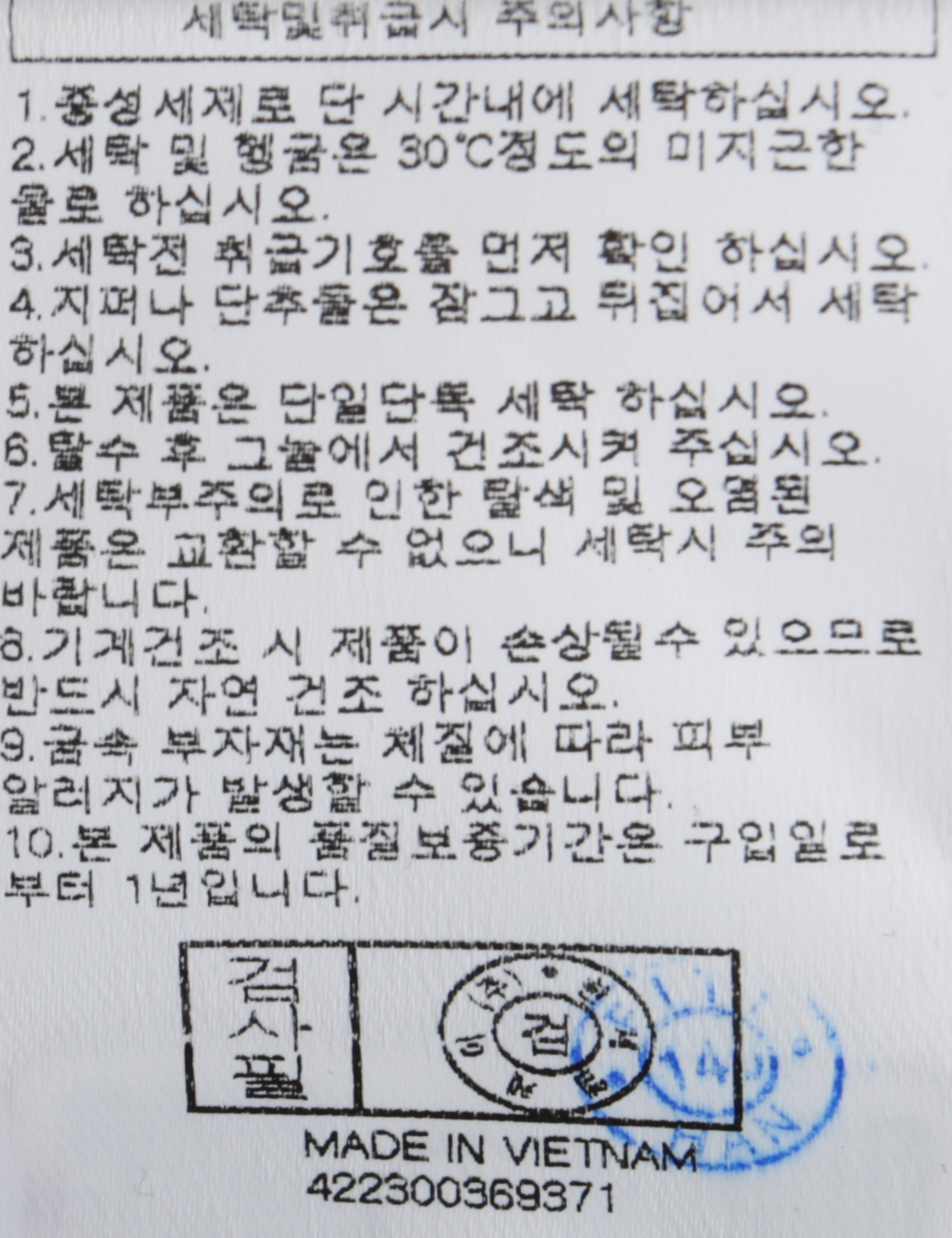 | 세탁방법 및 취급시 주의사항 | 중성세제로 단 시간내에 세탁하십시오.(케어라벨참고) |