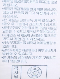 | 세탁방법 및 취급시 주의사항 | 본 제품은 손세탁 하십시오.(케어라벨참고) |