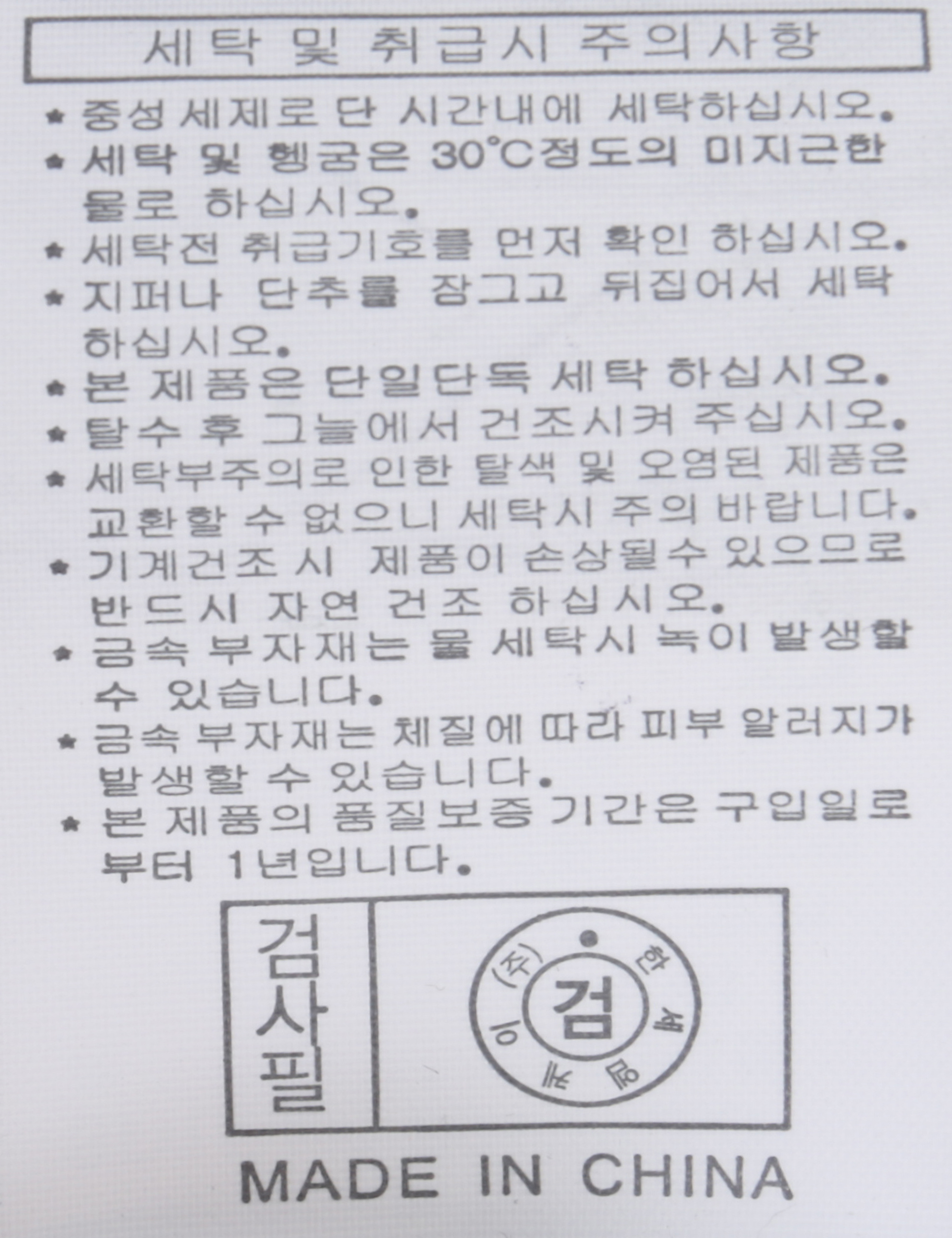 | 세탁방법 및 취급시 주의사항 | 본 제품은 손세탁 하십시오.(케어라벨참고) |