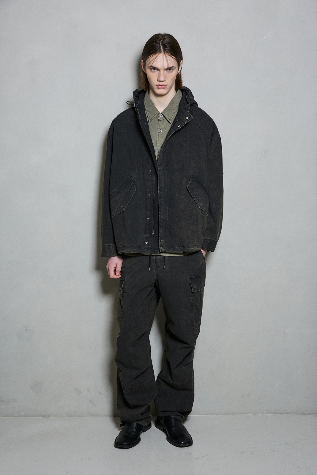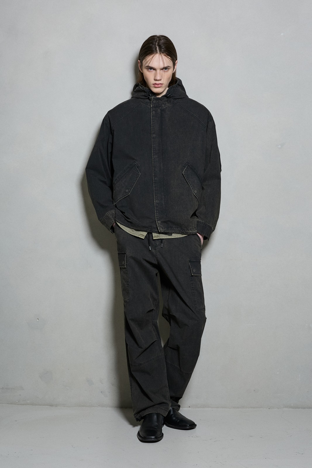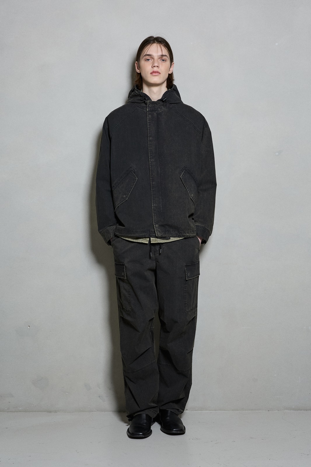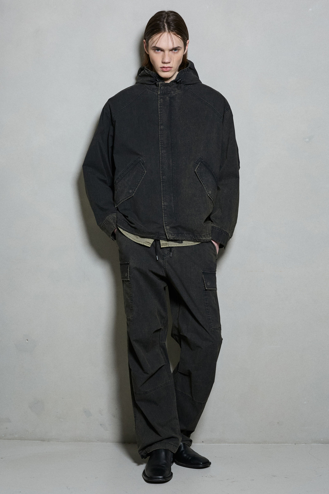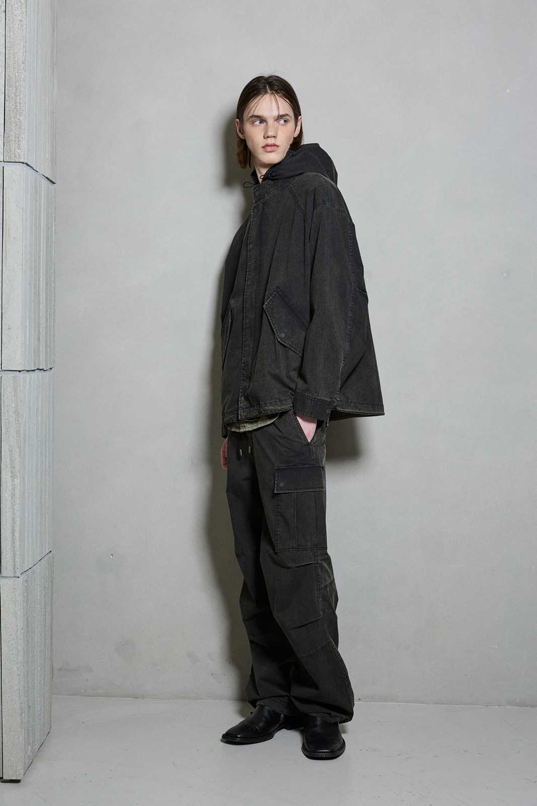 *C/N 소재에 에시드 워싱 기법으로 빈티지한 무드와 여유있는 핏감의 파라슈트 카고 팬츠