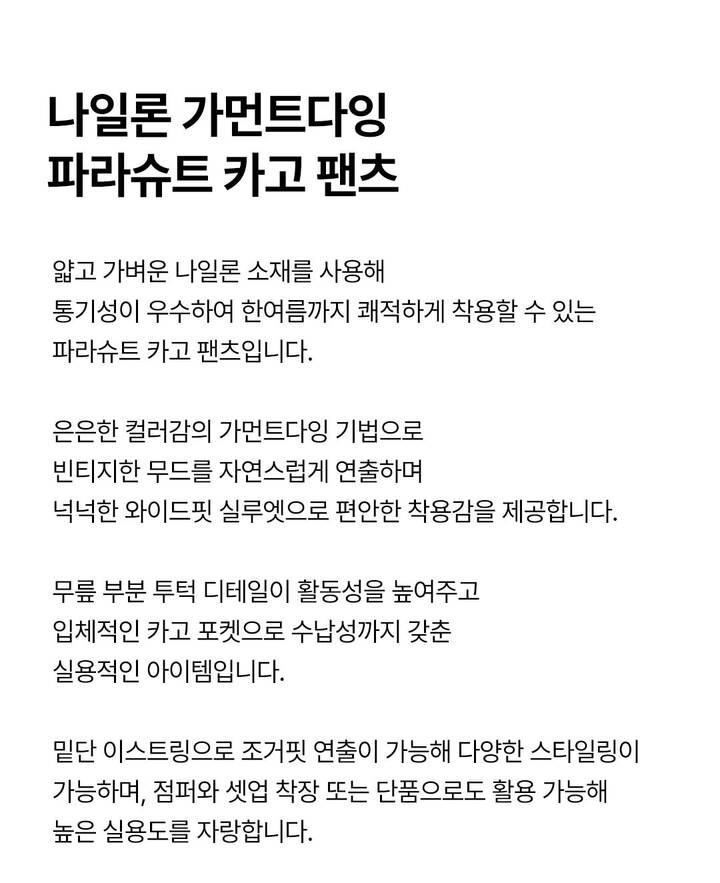 | 상품명 | 나일론 가먼트다잉 파라슈트 카고 팬츠(B252PT220P) |