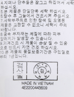 | 세탁방법 및 취급시 주의사항 | 본 제품은 손세탁 하십시오.(케어라벨참고) |