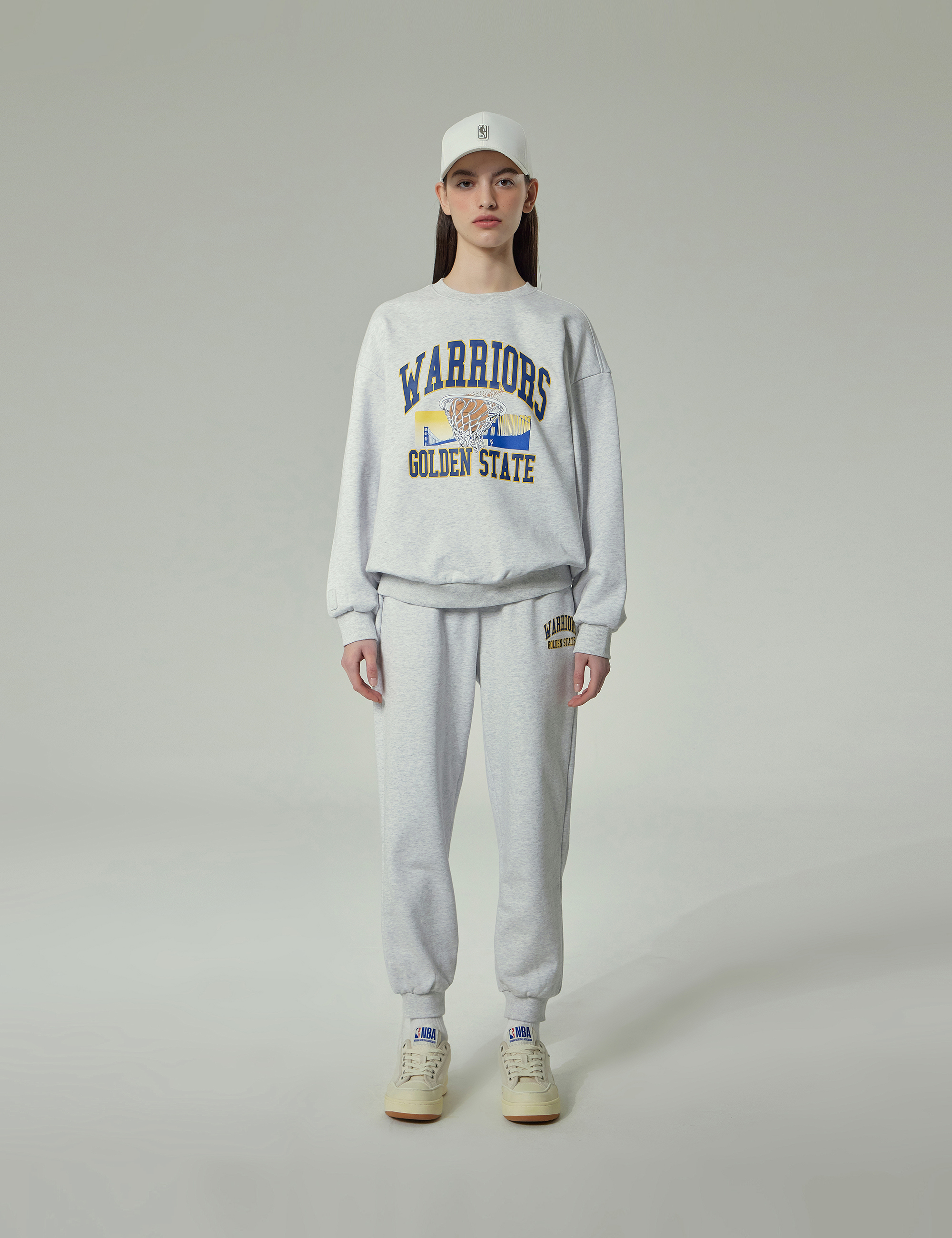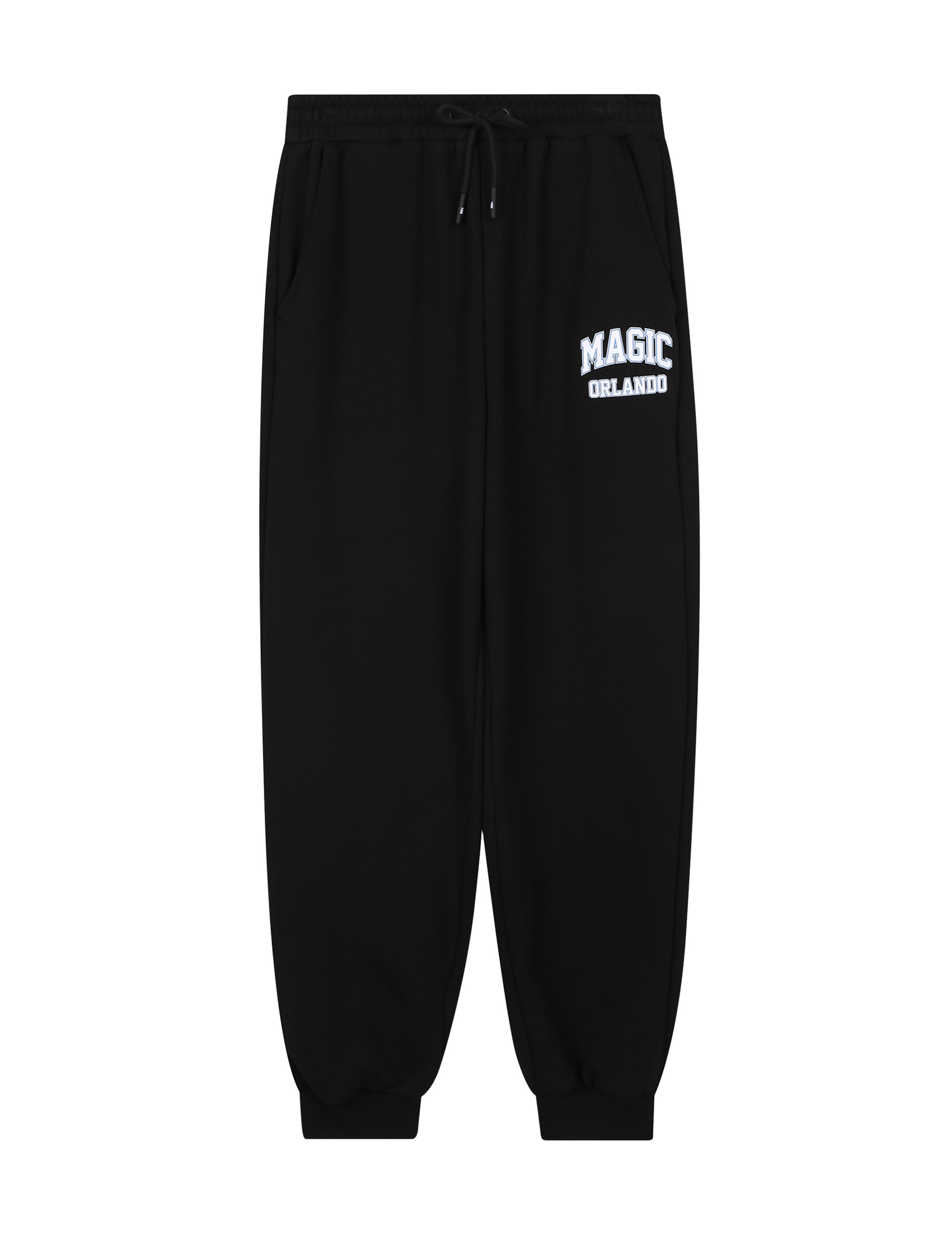 트렌디한 바시티 무드의 아치형 그래픽 조거팬츠