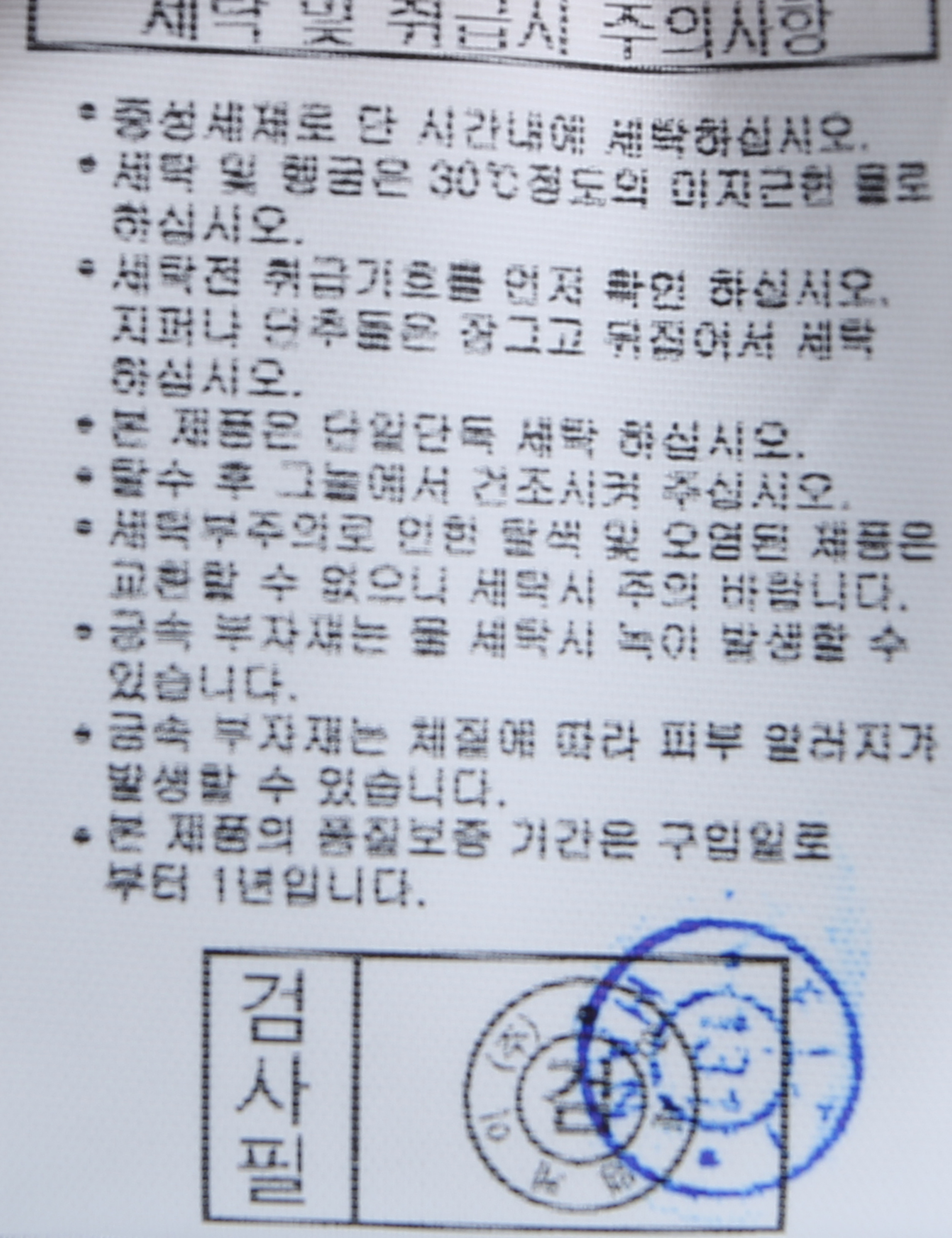 세탁방법 및 취급시 주의사항 중성세제로 단 시간내에 세탁하십시오.(케어라벨참고)
