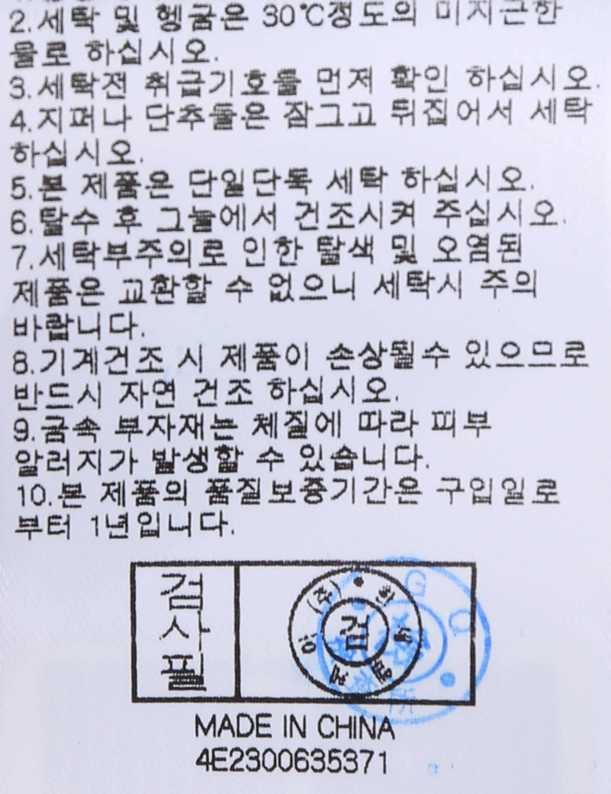 | 세탁방법 및 취급시 주의사항 | 중성세제로 단 시간내에 세탁하십시오.(케어라벨참고) |