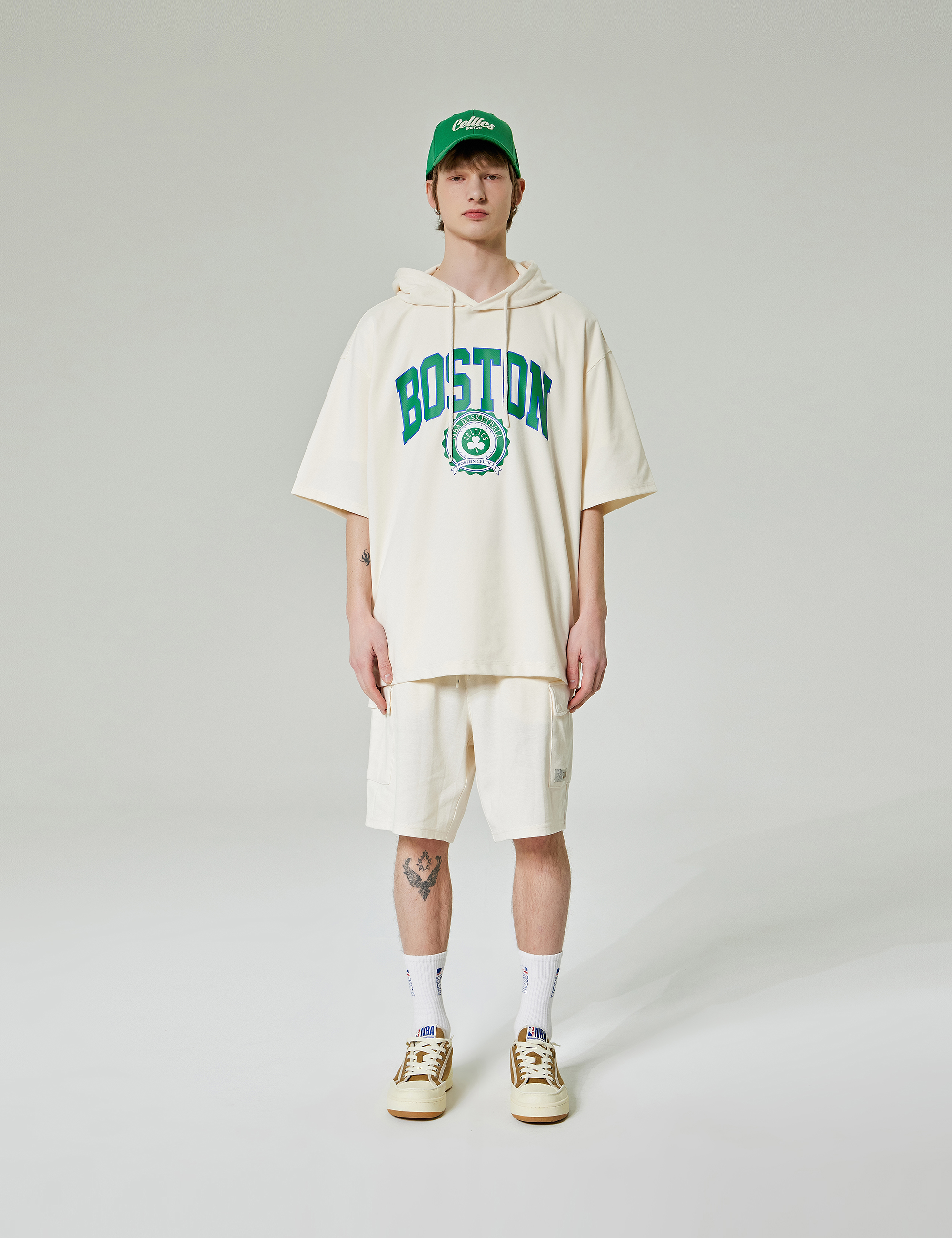 깔끔한 포인트 라벨과 카고 포켓이 달린 5부 트레이닝 팬츠