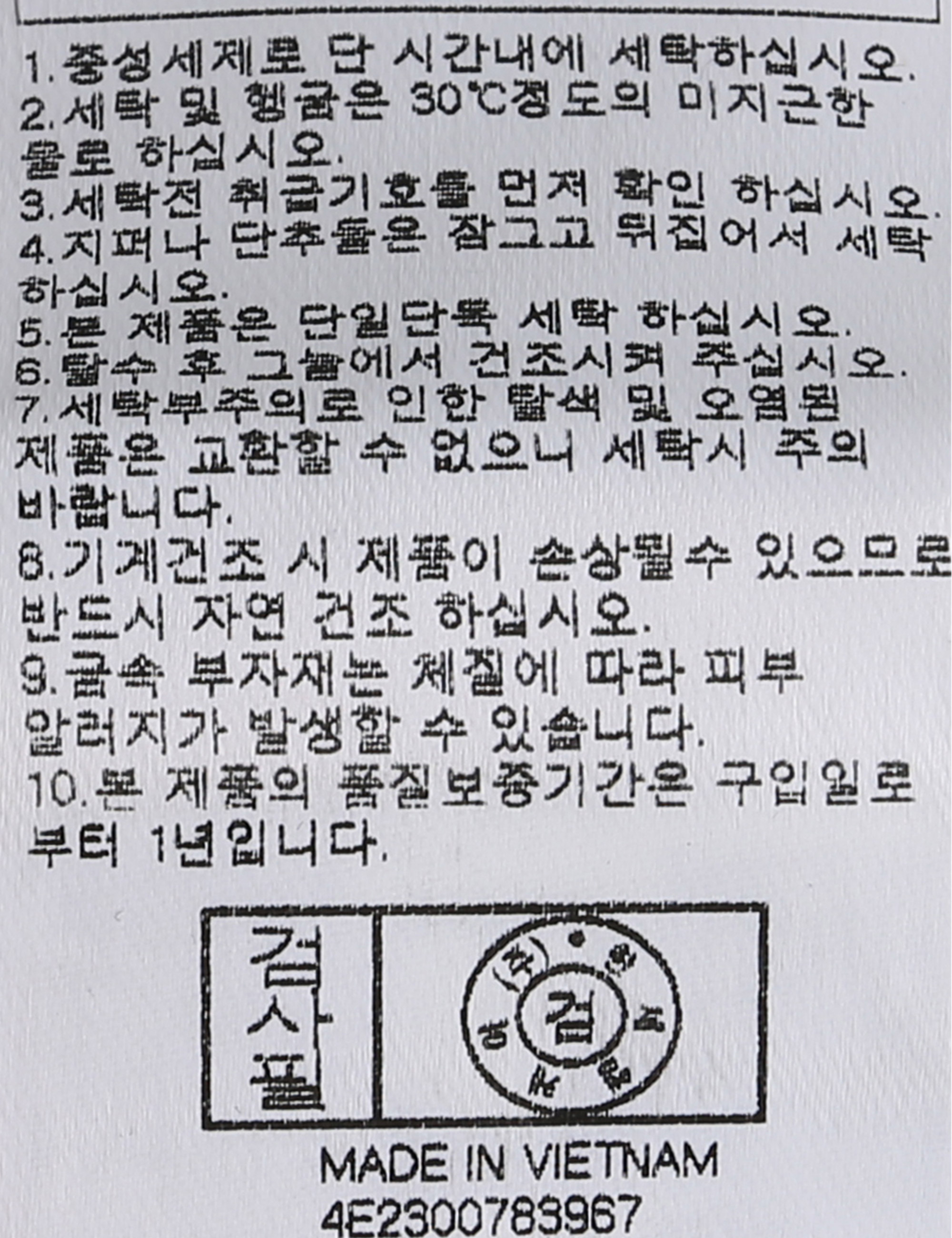 세탁방법 및 취급시 주의사항 중성세제로 단 시간내에 세탁하십시오.(케어라벨참고)