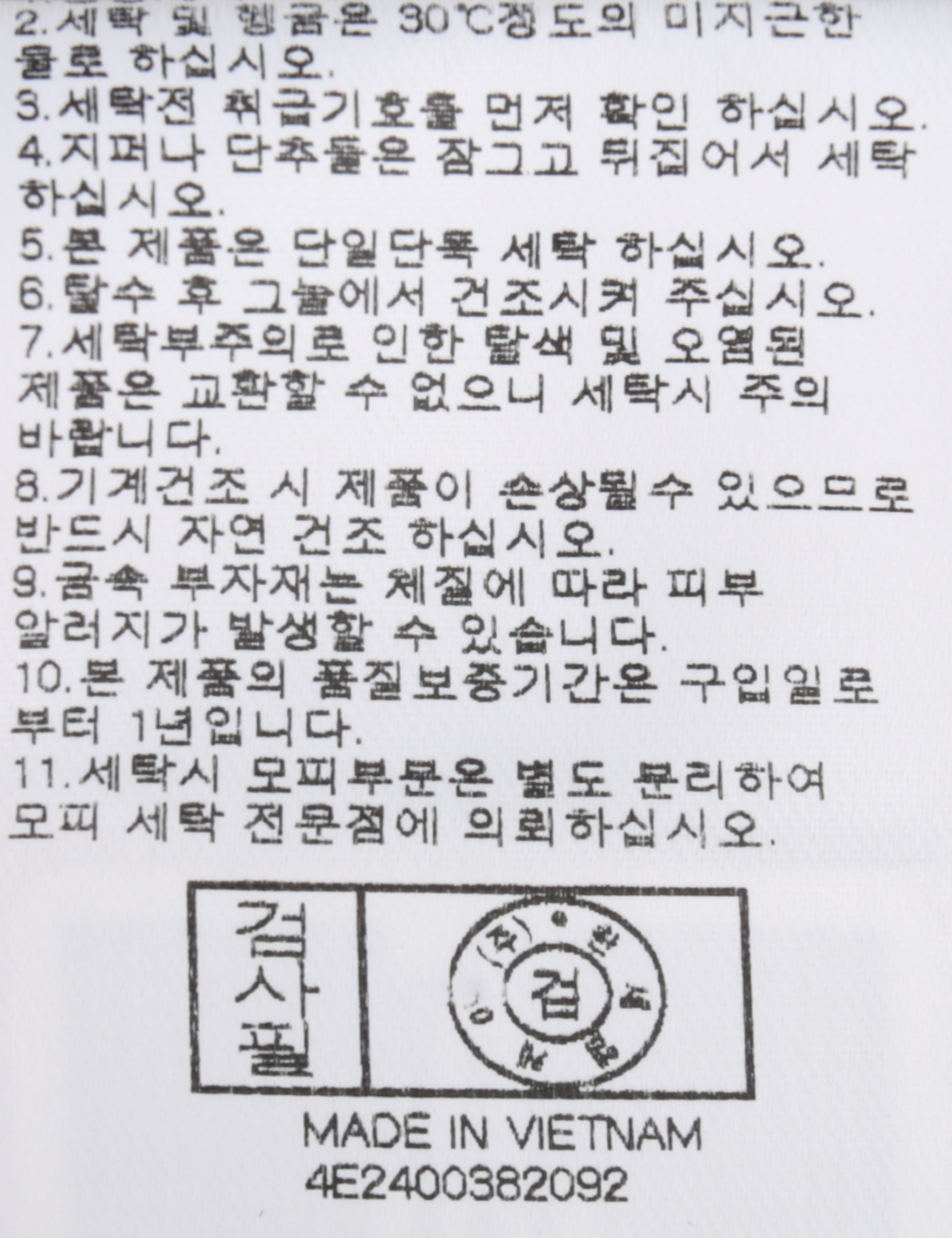 | 세탁방법 및 취급시 주의사항 | 중성세제로 단 시간내에 세탁하십시오.(케어라벨참고) |