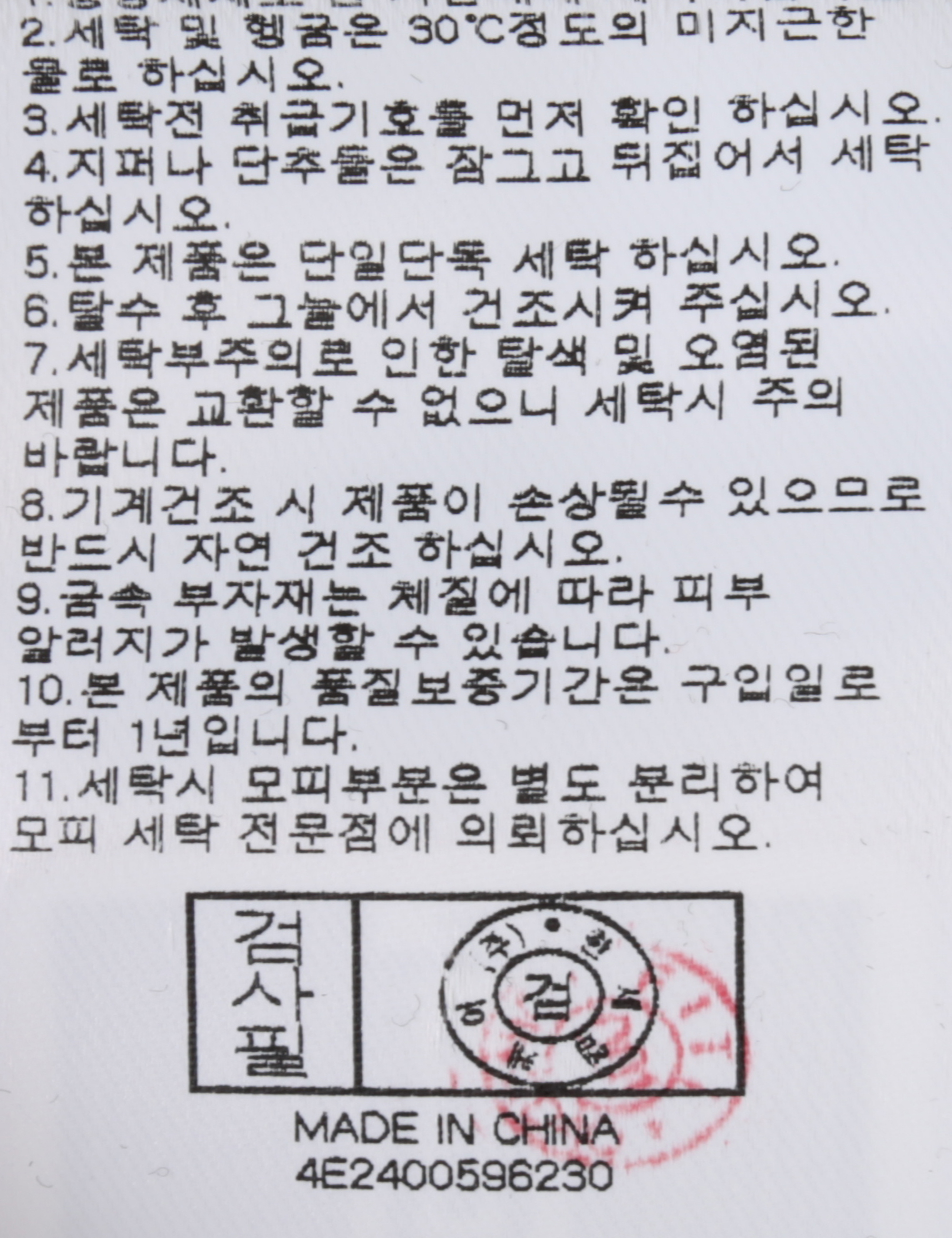 세탁방법 및 취급시 주의사항 중성세제로 단 시간내에 세탁하십시오.(케어라벨참고)