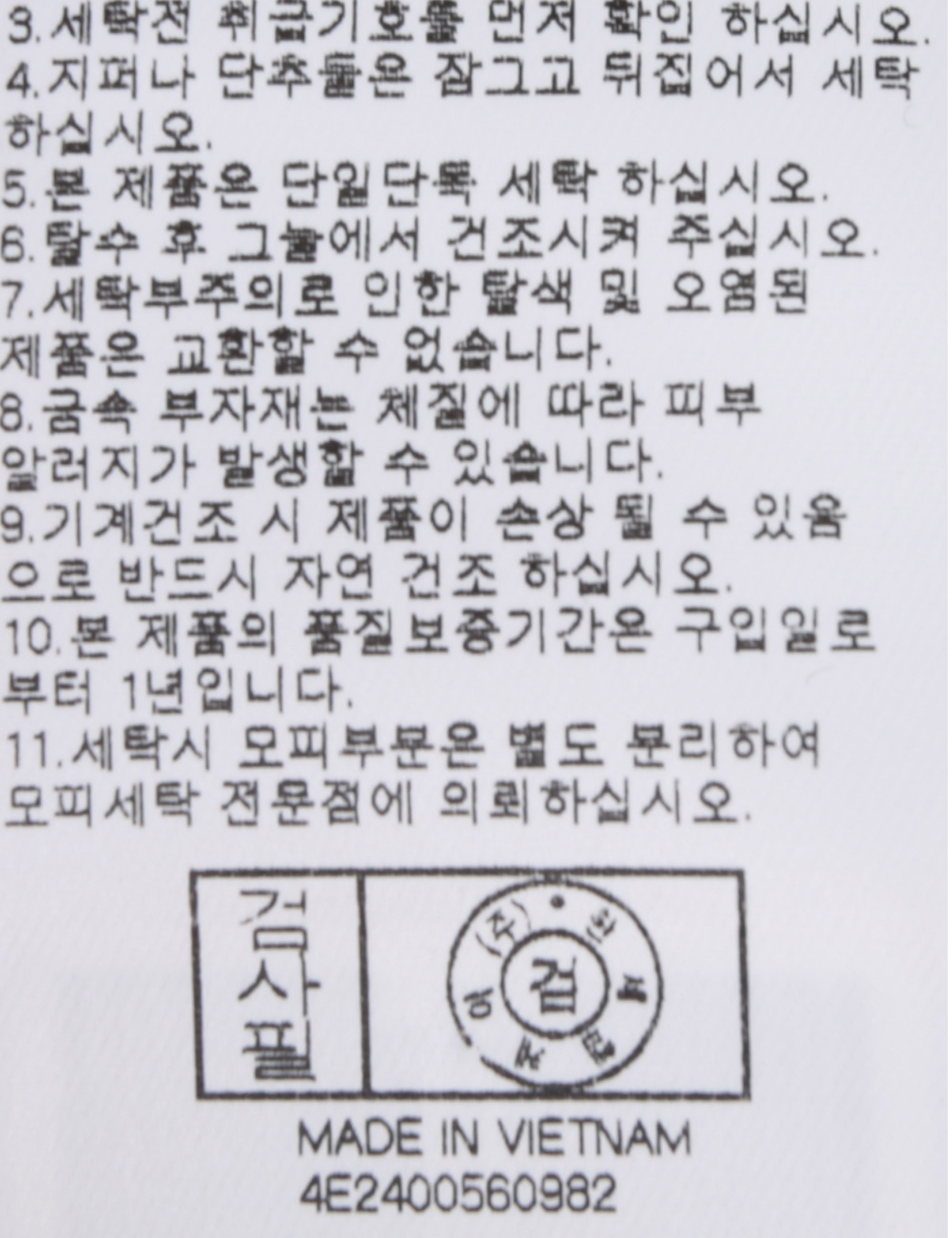 | 세탁방법 및 취급시 주의사항 | 본 제품은 손세탁 하십시오.(케어라벨참고) |