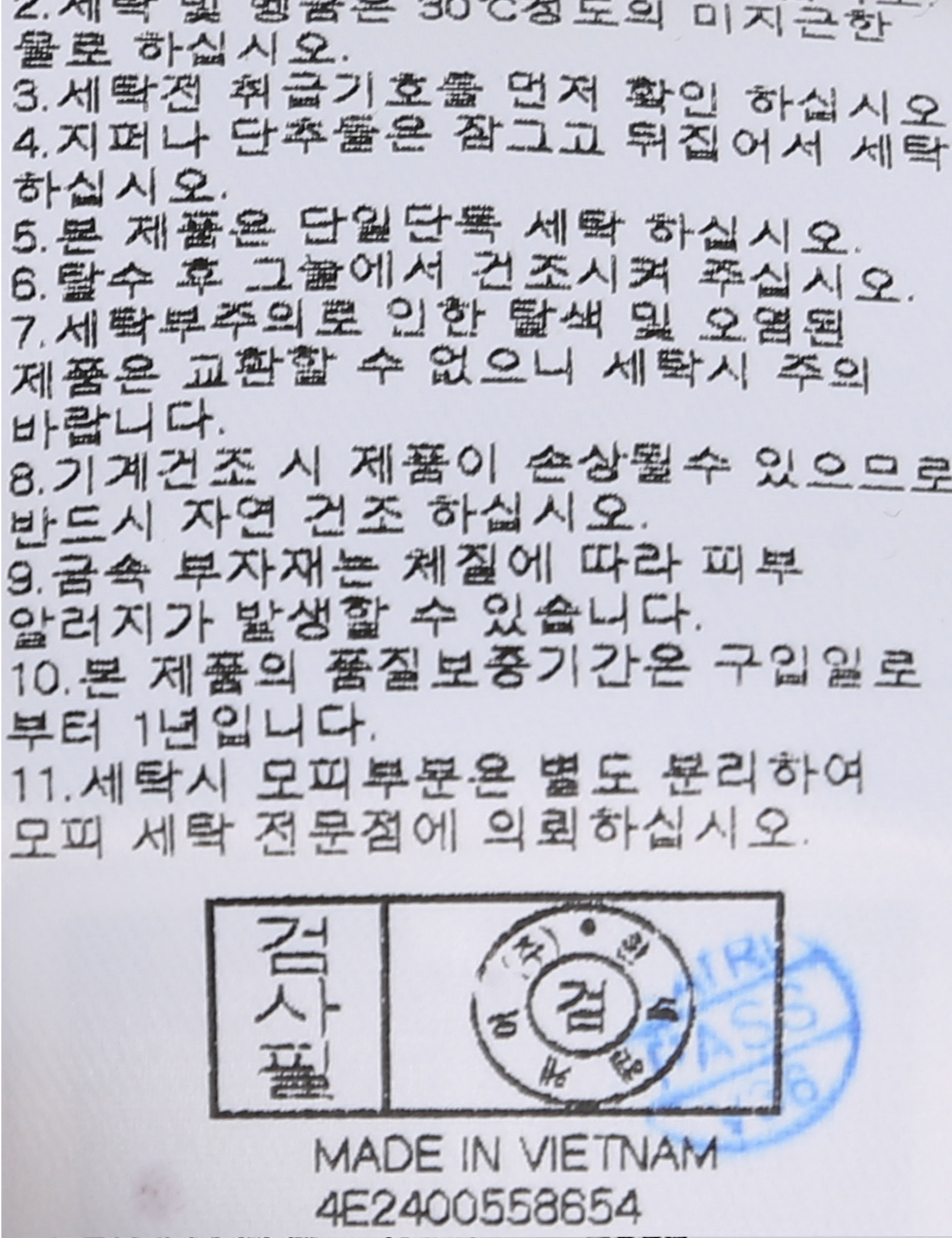 | 세탁방법 및 취급시 주의사항 | 중성세제로 단 시간내에 세탁하십시오.(케어라벨참고) |