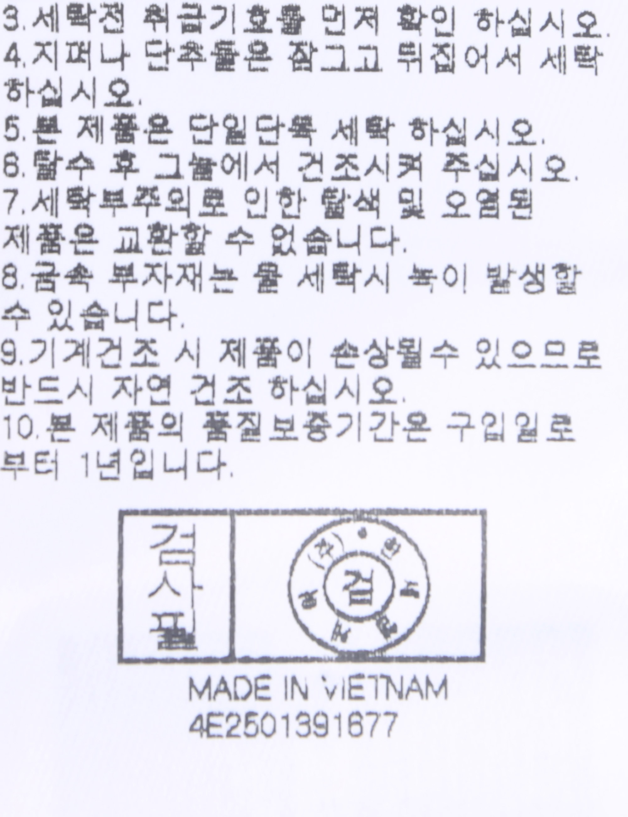 | 세탁방법 및 취급시 주의사항 | 본 제품은 손세탁 하십시오.(케어라벨참고) |