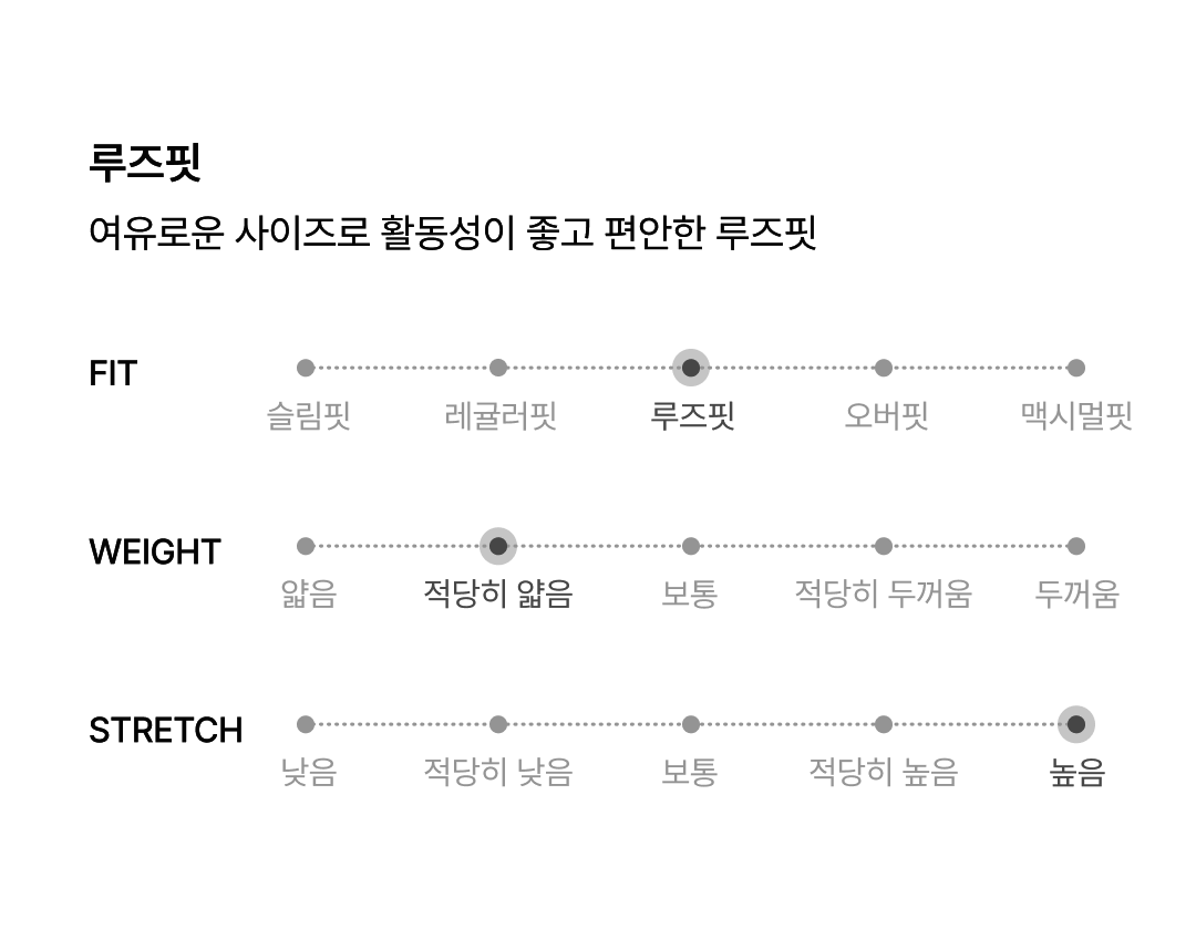 겉감(나일론 스판): 가볍고 신축성이 있어 활동 시 편안한 착용감을 제공. 안감(폴리에스터 100%): 피부에 닿는 면적을 줄여 쾌적한 착용감을 유지.