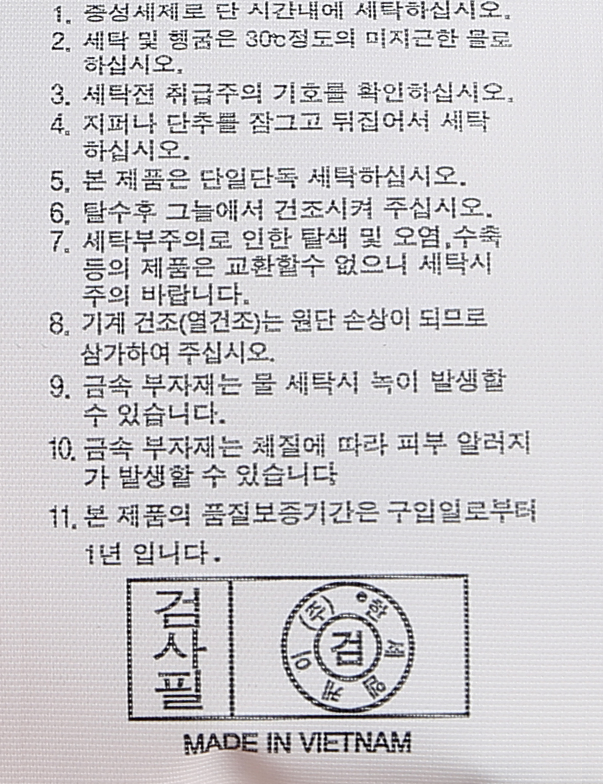 | 세탁방법 및 취급시 주의사항 | 중성세제로 단 시간내에 세탁하십시오.(케어라벨참고) |